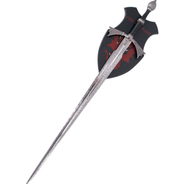 Además, la espada viene acompañada de un soporte de madera en forma de escudo de la casa Targaryen, el cual permite colgarla de manera segura y exhibirla como un objeto de decoración único. Con un tamaño de 107 cm y una hoja de 82 cm, esta espada no solo es un objeto llamativo, sino que también es lo suficientemente grande como para destacar en cualquier espacio.