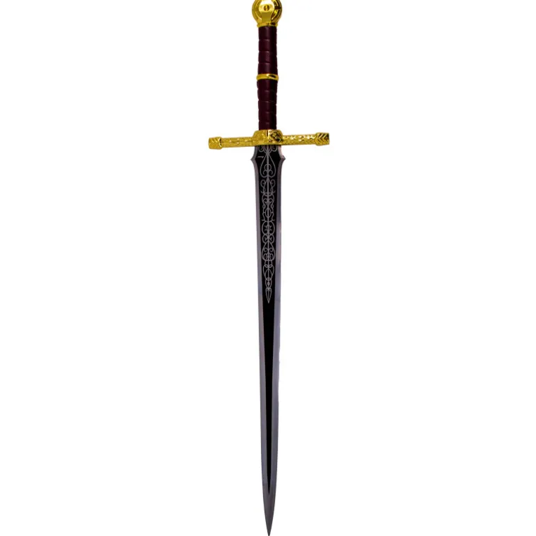 Con un tamaño total de 96,5 cm, esta espada se distingue por su hoja de acero de 72 cm de longitud y un grosor de 3,7 mm, lo que le otorga una presencia robusta y sólida. La elección de acero para la producción de la hoja asegura no solo durabilidad, sino también un acabado que resalta la elegancia y el poder del arma. Su acabado en negro, combinado con los elementos dorados del pomo y la cruz, hace que la espada sea visualmente impactante y atractiva para cualquier coleccionista.