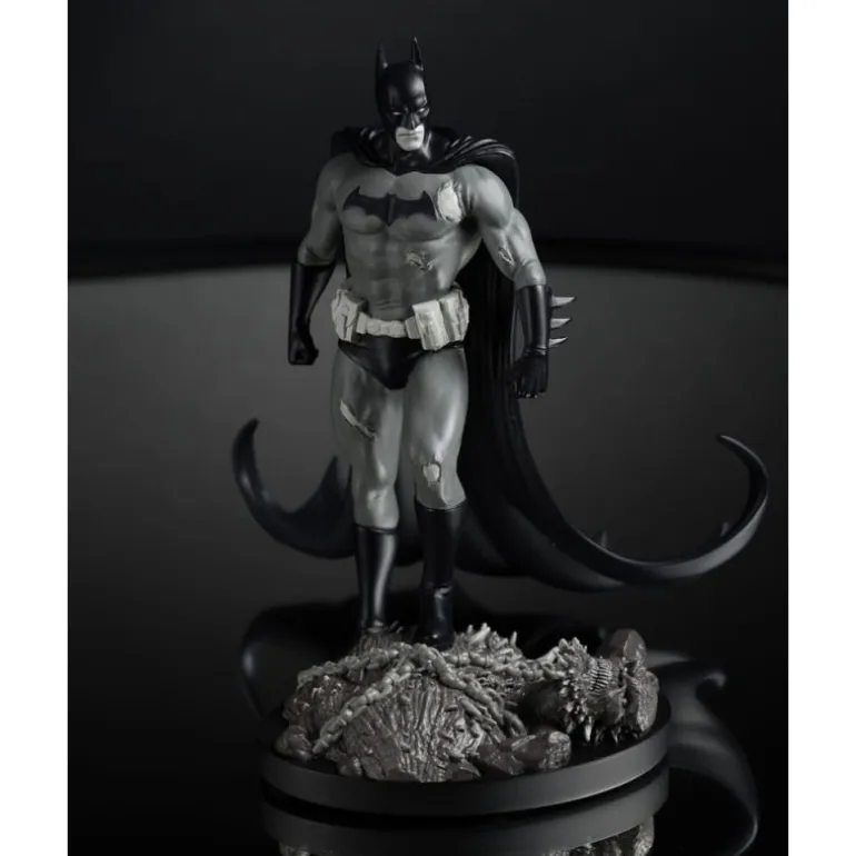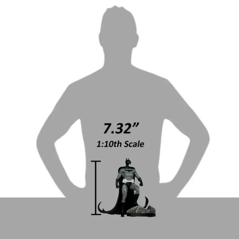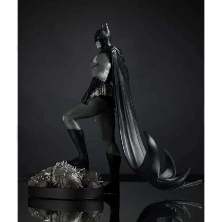 Batman se erige sobre una base detallada que simula un terreno rocoso, realzando su postura heroica y serena. Los acabados en tonos grises y negros subrayan su actitud vigilante. Esta estatua con licencia oficial es perfecta para coleccionistas y admiradores del universo DC, y se presenta como un regalo ideal o un destacado elemento decorativo en cualquier colección.