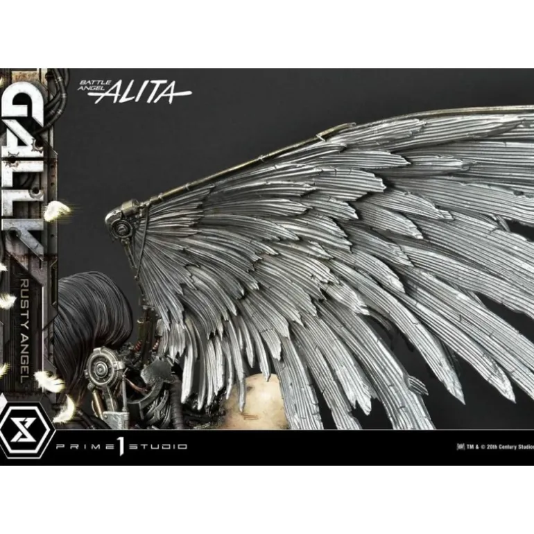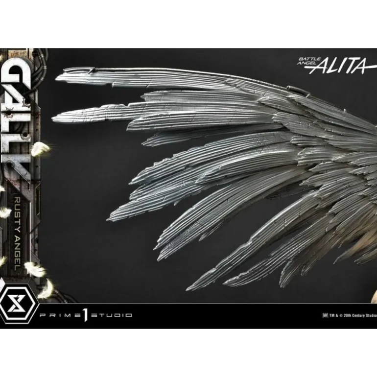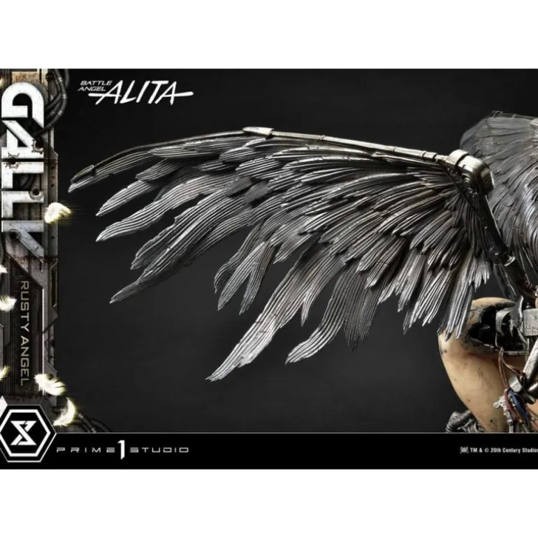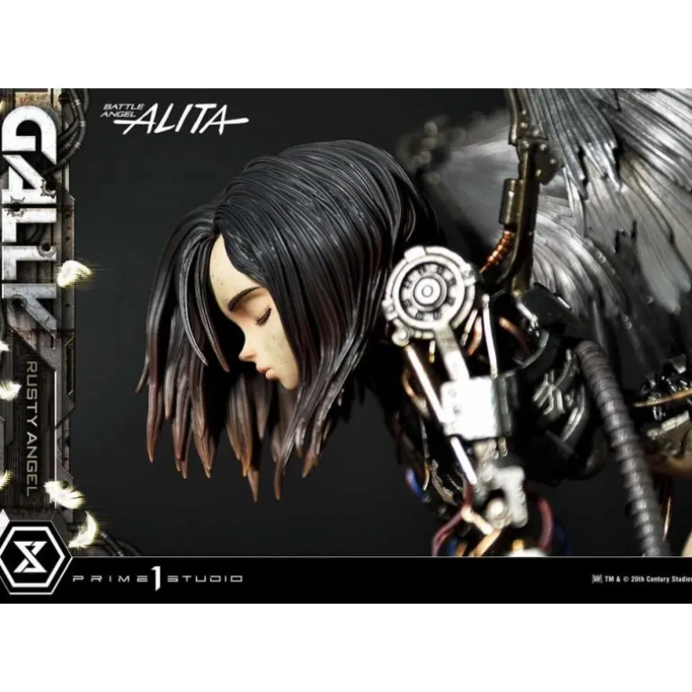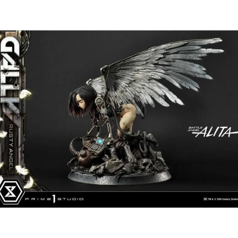La estatua presenta a Alita con impresionantes alas metálicas desplegadas, rodeada de un entorno lleno de cables y componentes mecánicos, simbolizando su naturaleza cyborg. Su expresión y postura evocan fuerza y vulnerabilidad, cualidades icónicas de este personaje entrañable.
