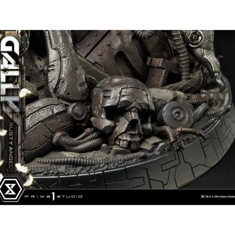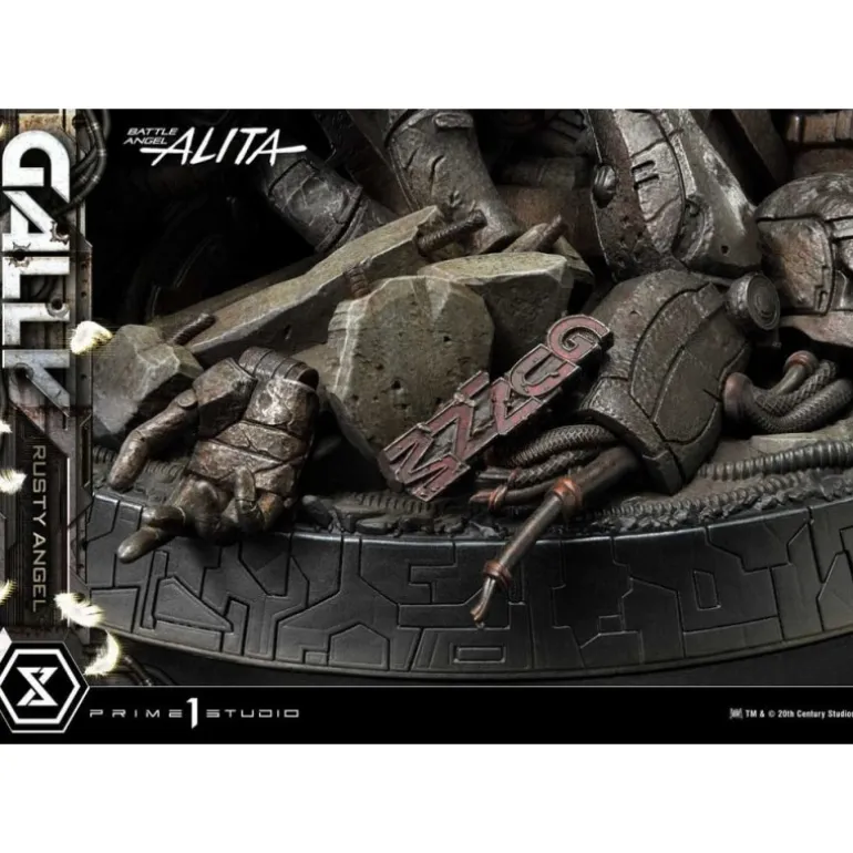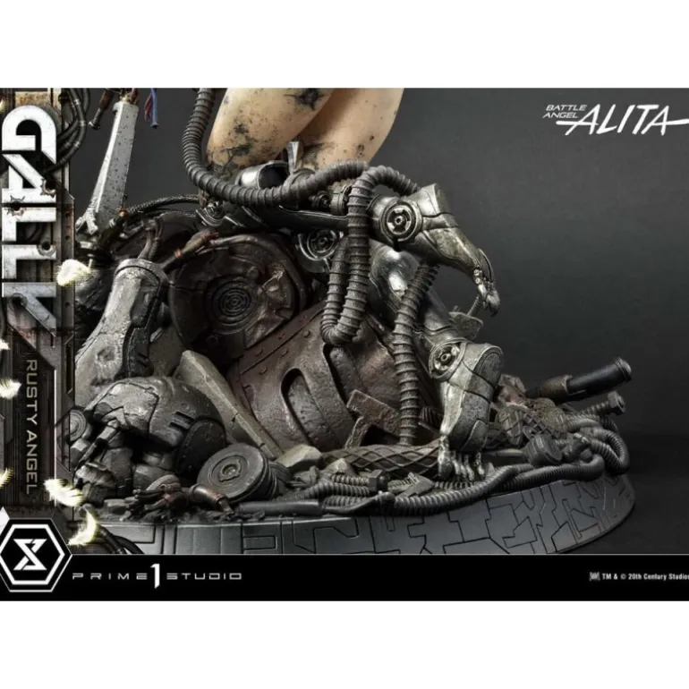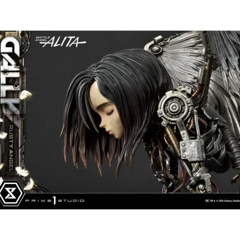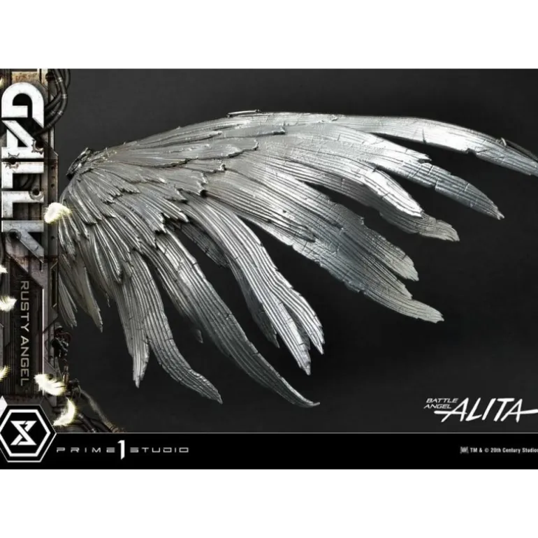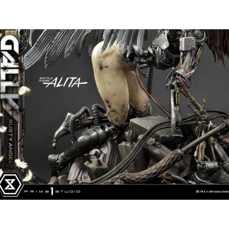 La estatua presenta a Alita con impresionantes alas metálicas desplegadas, rodeada de un entorno lleno de cables y componentes mecánicos, simbolizando su naturaleza cyborg. Su expresión y postura evocan fuerza y vulnerabilidad, cualidades icónicas de este personaje entrañable.