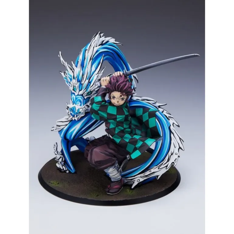 El personaje se muestra en una postura de ataque poderosa, blandiendo su espada con determinación. La escultura también incluye un dragón de agua azul, que añade un efecto visual impresionante y realza la magnificencia de la figura. Viene empaquetada en una elegante caja con ventana, ideal para exhibición o regalo.