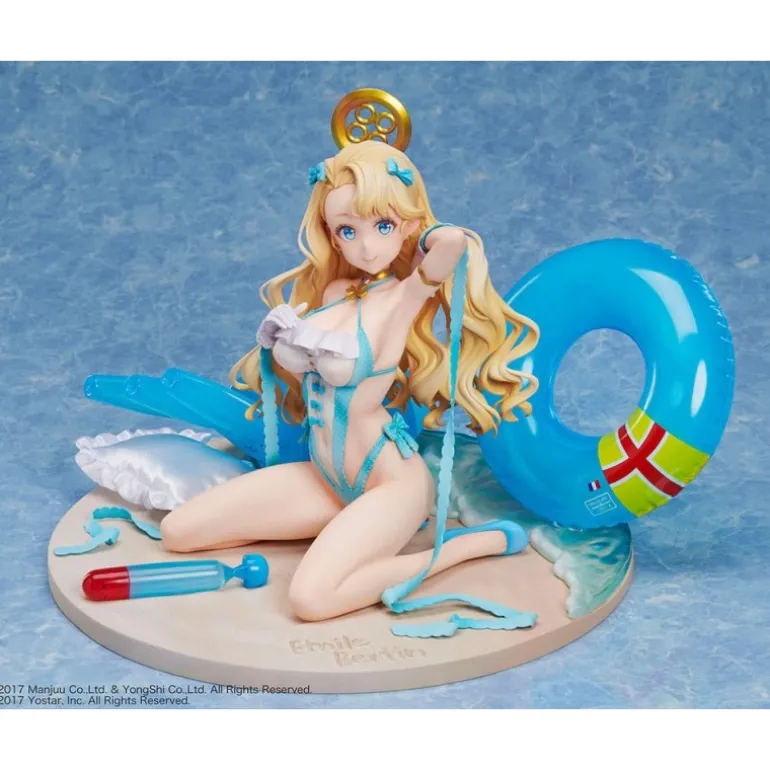 La estatua de Emile Bertin de Azur Lane, fabricada por Design COCO, es una obra maestra en PVC a escala 1/4 que captura la esencia del personaje en un entorno veraniego. Con una altura de 21 cm, esta figura muestra a Emile Bertin en un elegante y detallado traje de baño azul claro que resalta su personalidad coqueta y elegante. El conjunto incluye accesorios como un flotador azul y detalles esculpidos con gran precisión.