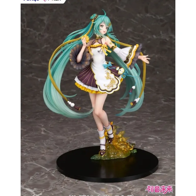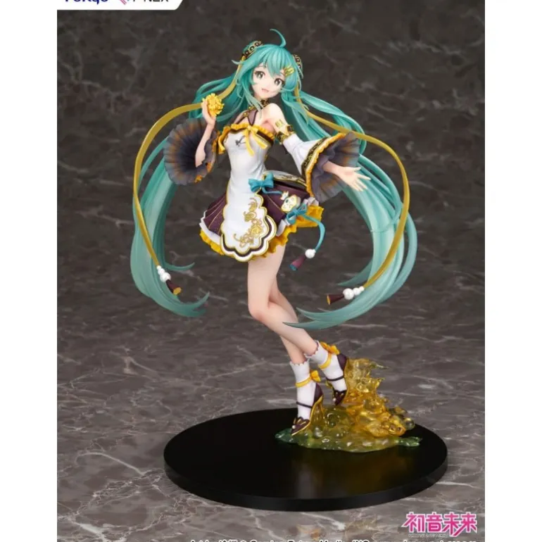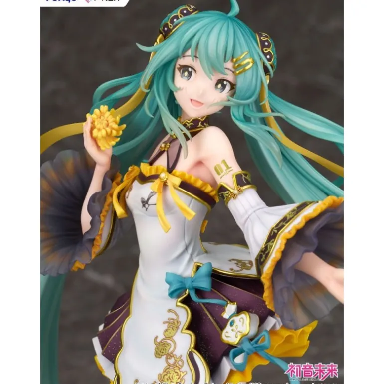 Descubre la estatua detallada de Hatsune Miku en su versión Mid-Autumn Festival, cuidadosamente diseñada por Furyu. Esta pieza de colección de 27 cm captura la esencia de Miku con un meticuloso nivel de detalle. Sus vibrantes colores pastel y su vestuario inspirado en festividades orientales llenan de vida a esta figura. El vestido blanco con detalles dorados y amarillos combina con su icónico cabello verde, aportando un contraste visual impresionante.