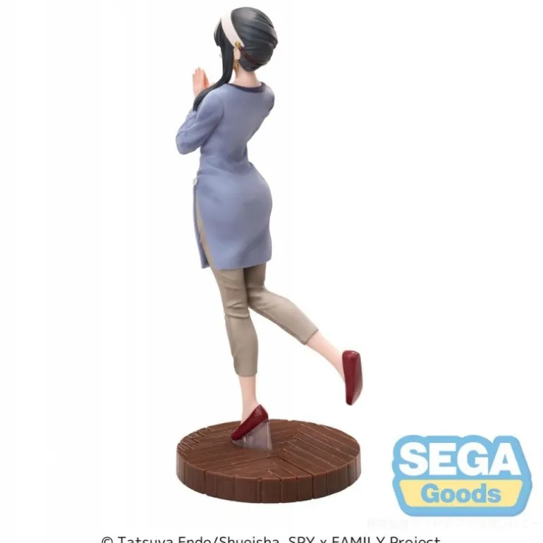 La estatua presenta a Yor Forger en una pose dinámica y elegantemente vestida. Lleva un vestido azul claro que resalta sus movimientos, combinado con pantalones beige y zapatos rojos, creando un contraste atractivo. El cabello negro está recogido con una diadema blanca, lo que añade un toque sutil y sofisticado a su apariencia. La expresión de su rostro refleja a la perfección el carácter y elegancia del personaje.