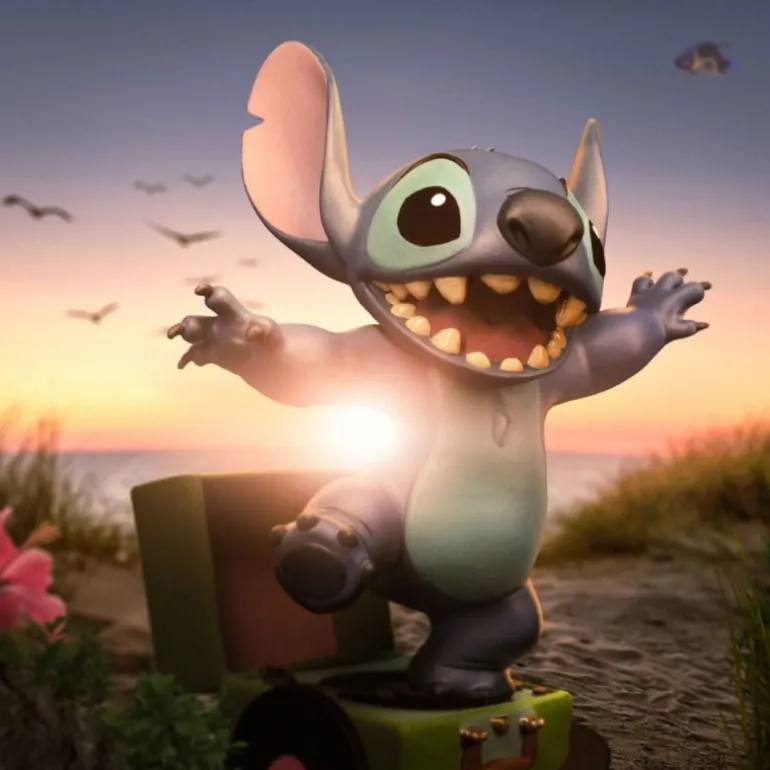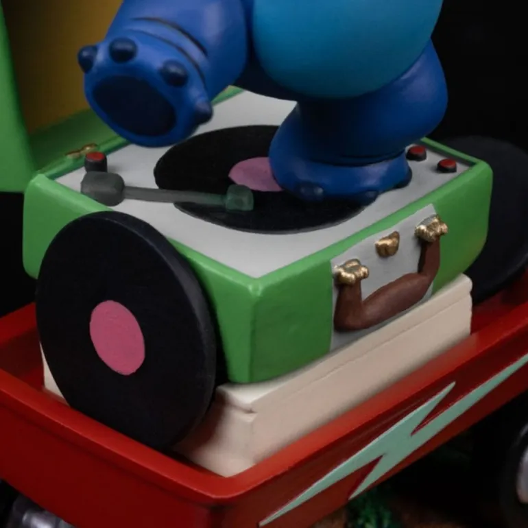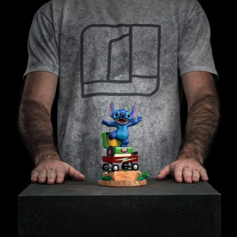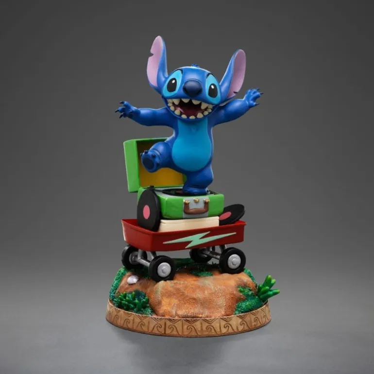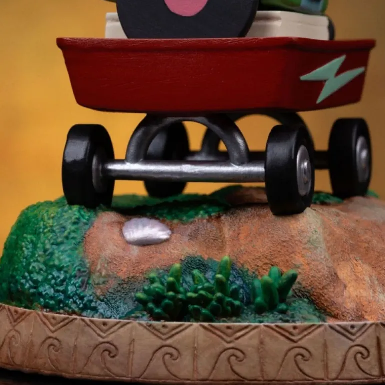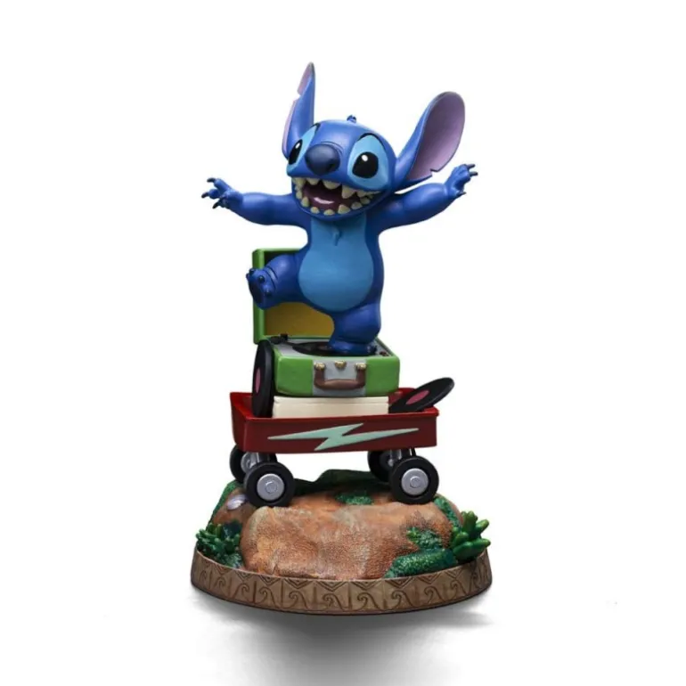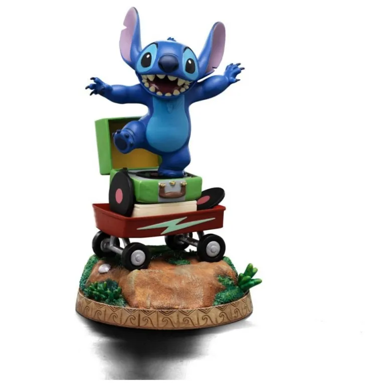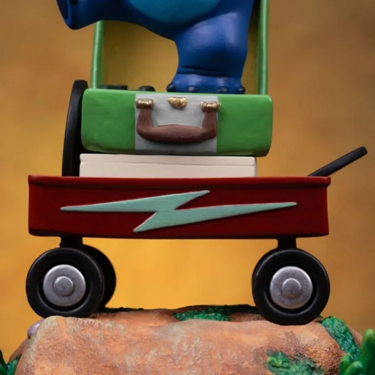 La base de la escultura simula un terreno natural, con un carrito rojo donde Stitch está apoyado, complementando la escena con detalles de equipaje, resaltando aún más la narrativa y el dinamismo. Es perfecta para un regalo original o para ampliar tu colección personal de artículos de colección.