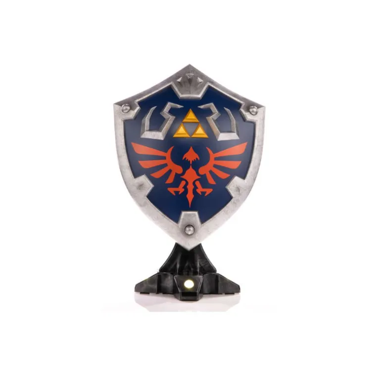Se trata de una réplica oficial diseñada y fabricada por la prestigiosa firma First 4 Figures, completamente fiel al escudo original, tal como aparece en este caso en The Legend of Zelda: Breath of the Wild, que cuenta con unas dimensiones de 29 x 20 x 13 cm, así que aunque no es de tamaño real, tampoco es una pieza pequeña. Está fabricada en PVC y tanto el trabajo de pintura como los acabados son absolutamente excepcionales, con cada uno de los detalles de este escudo muy bien reproducidos. Además, cuenta con una base especial diseñada para la ocasión, a la que el escudo de adhiere magnéticamente, y que cuenta con iluminación LED por lo que su presentación es una auténtica maravilla.