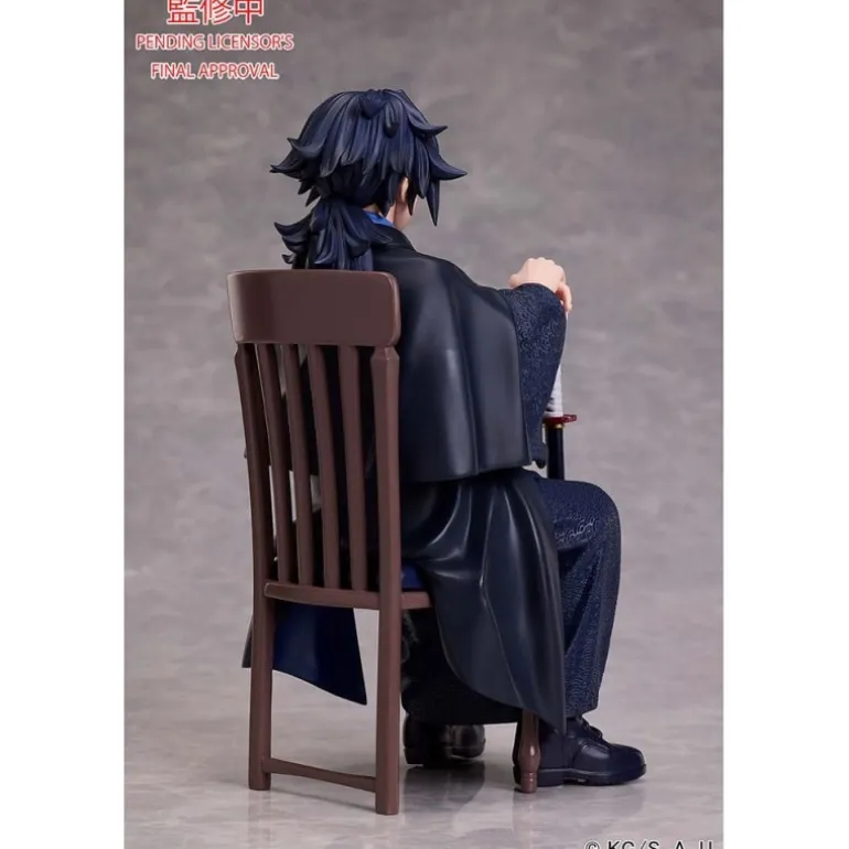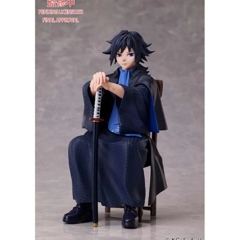 Giyu Tomioka, con su característico atuendo, se presenta sentado con su espada en las manos, mostrando una expresión decidida y serena. Los colores azul oscuro y negro dominan su vestimenta, acentuando su presencia imponente. Su cabello oscuro esculpido con precisión resalta su personalidad distintiva.