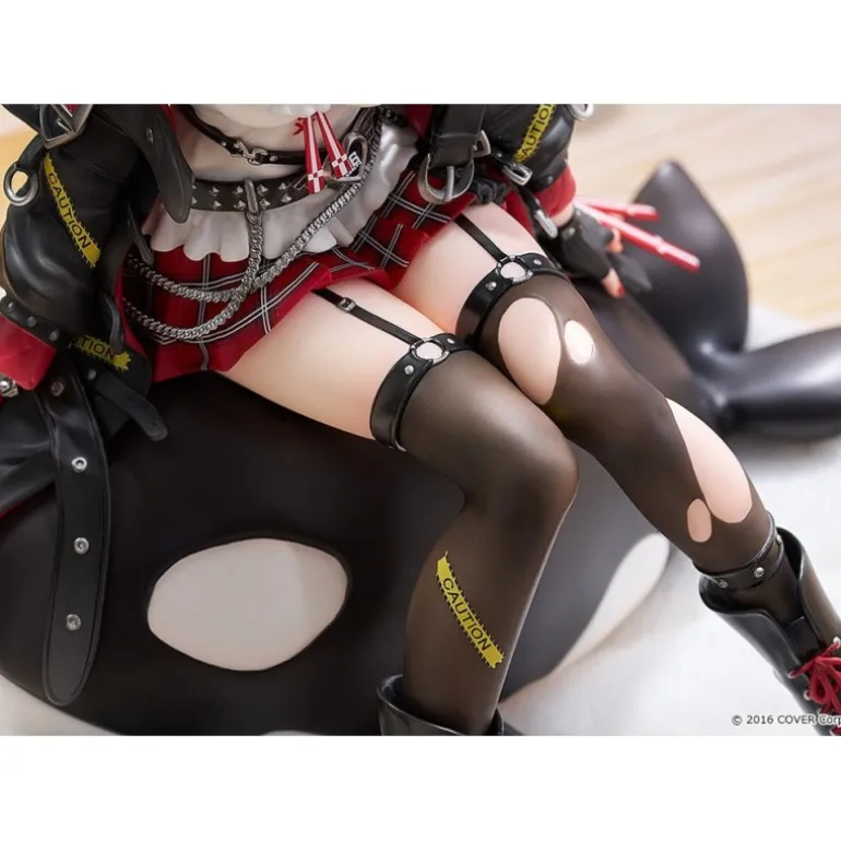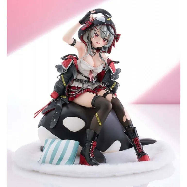 Chloe aparece sentada de manera relajada sobre una base mullida y acariciando un accesorio en la mano, luciendo su icónico atuendo con una chaqueta negra, falda a cuadros y medias de estilo punk. Su expresión amigable y su cabello plateado hacen que esta estatua sea un deleite visual desde cualquier ángulo.