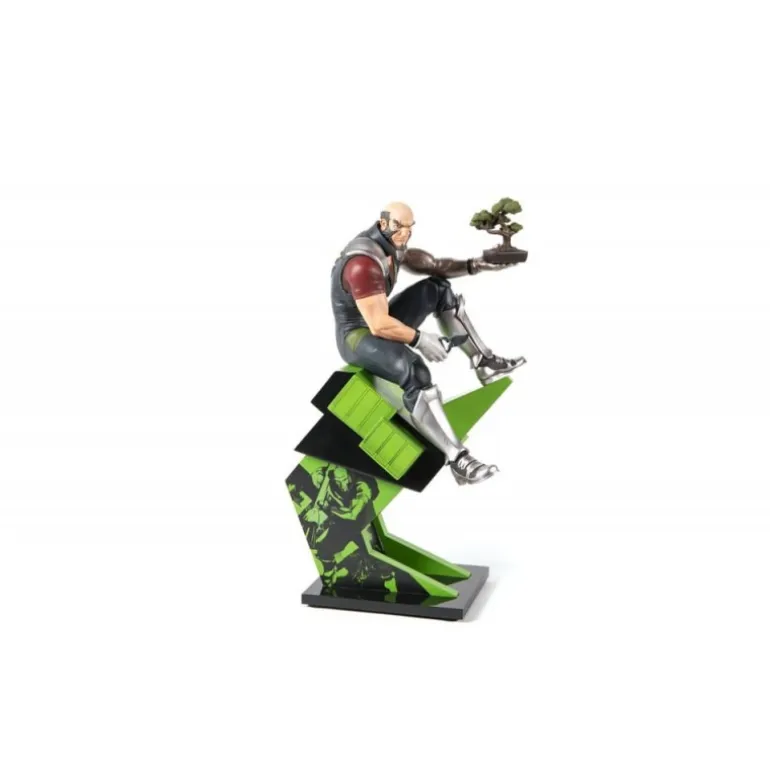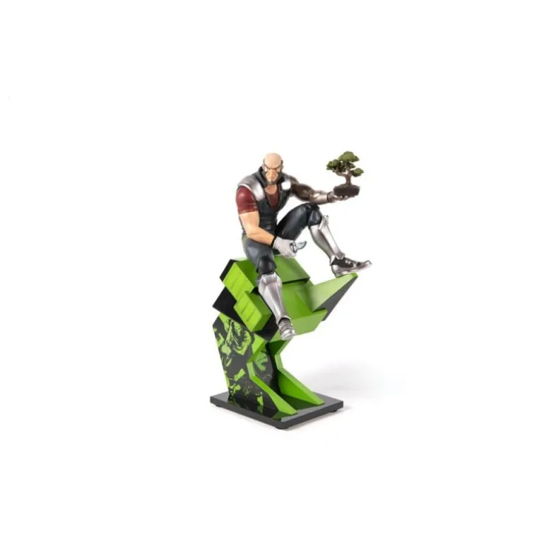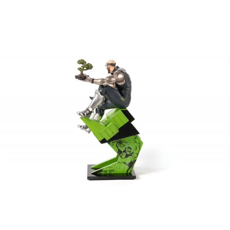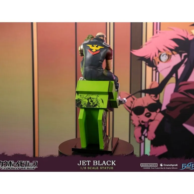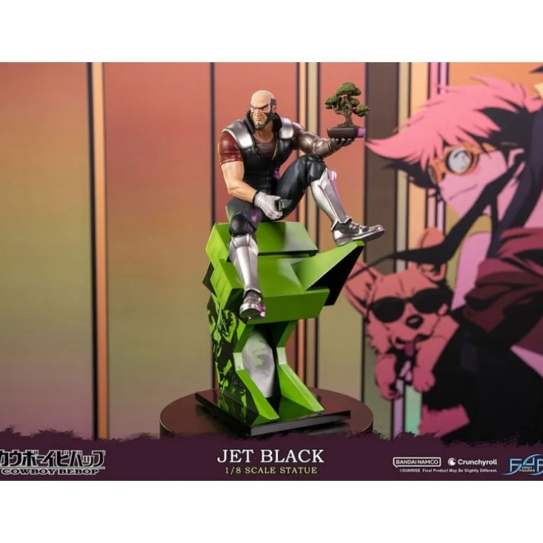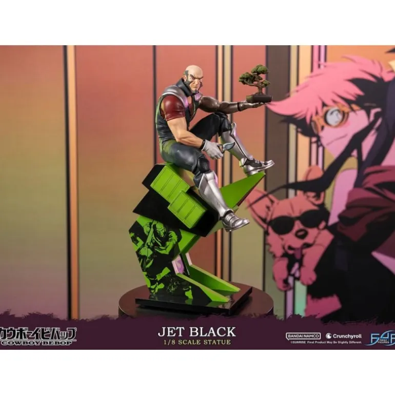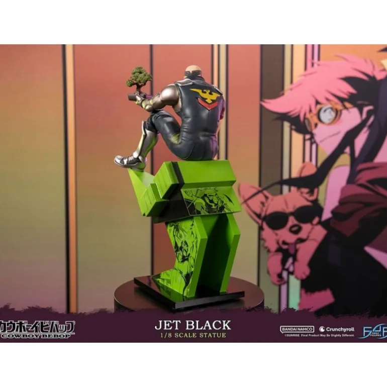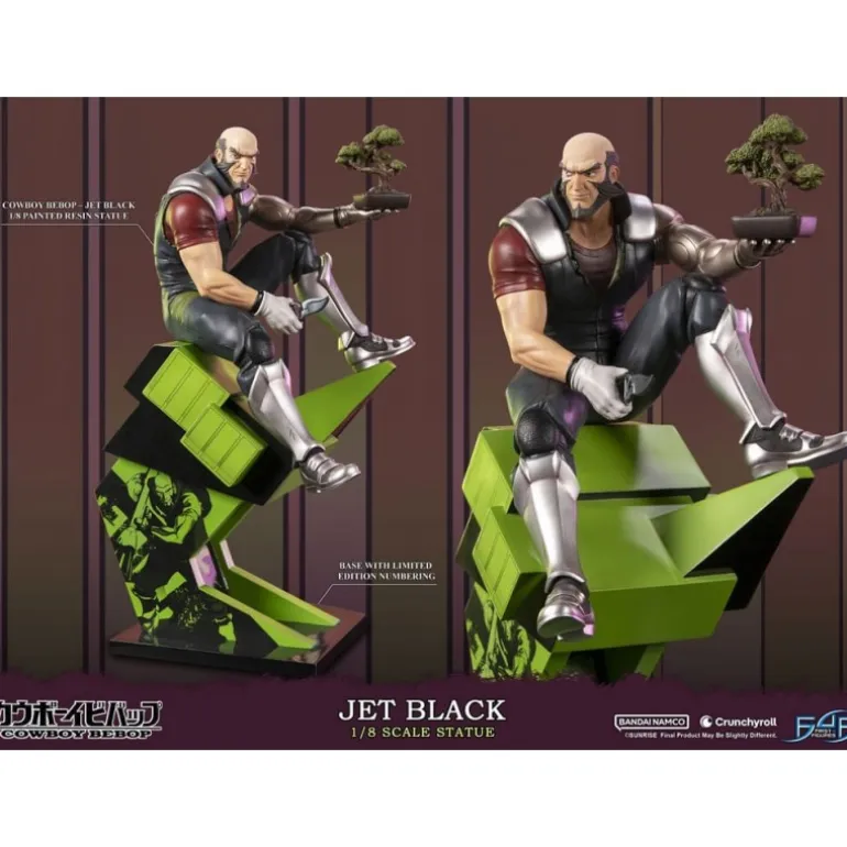 Jet Black se presenta en una pose enérgica y contemplativa, sosteniendo un bonsái, simbolizando su lado calmado y sereno en medio de la acción. La estatua se asienta sobre una base dinámica, con un diseño moderno en tonos verdes y negros que complementan la figura.