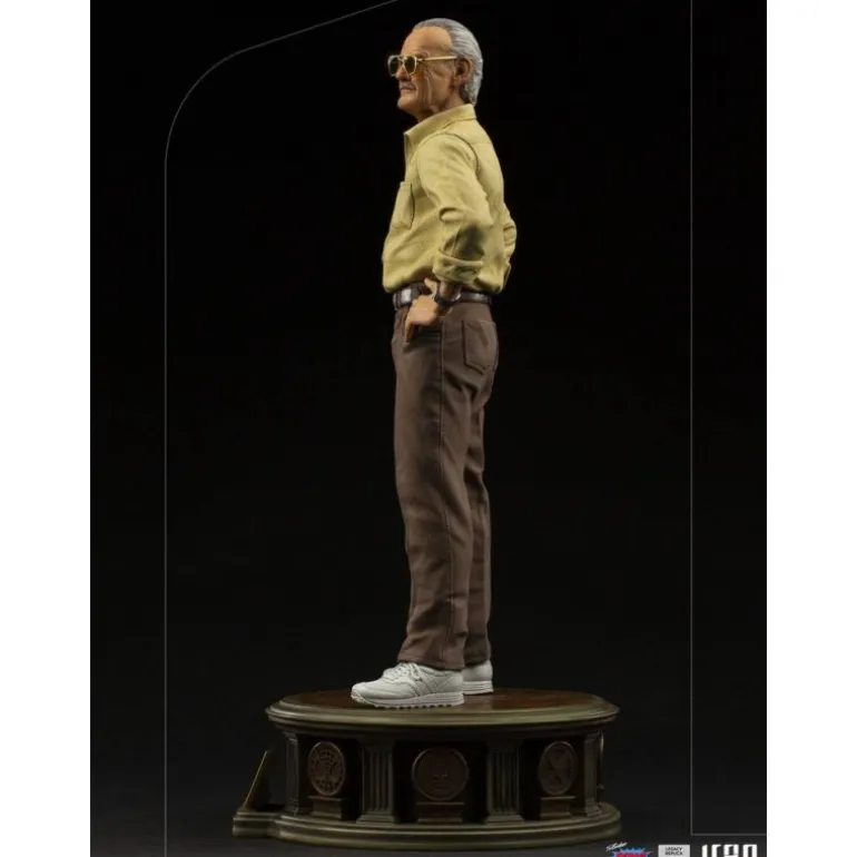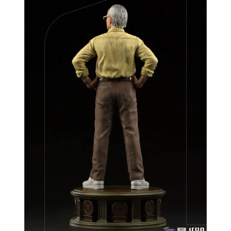 El modelo muestra a Stan Lee con su característica camisa amarilla y pantalones marrones, complementados con zapatos blancos, un look característico que celebra su legado. La atención al detalle es notable, desde las gafas hasta la expresión facial, cada elemento refleja el carácter y carisma del homenajeado.