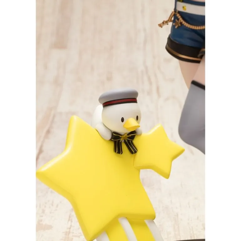 Subaru está vestida con un encantador atuendo azul, complementado con tirantes, un sombrero y botas altas. La figura refleja su carisma único, acompañada por accesorios decorativos como estrellas amarillas y girasoles, además de adorables patitos que añaden un toque alegre y divertido.