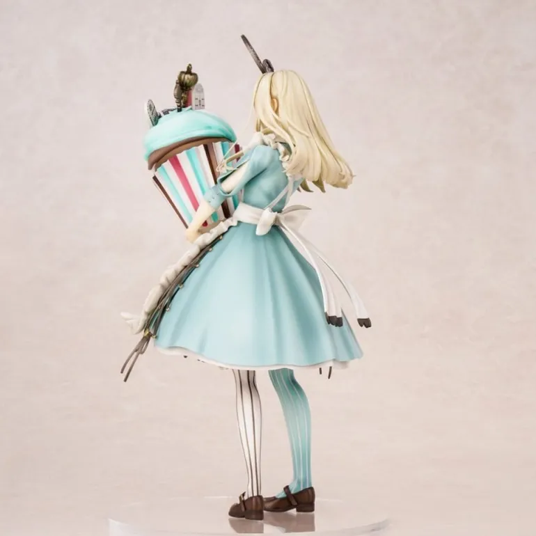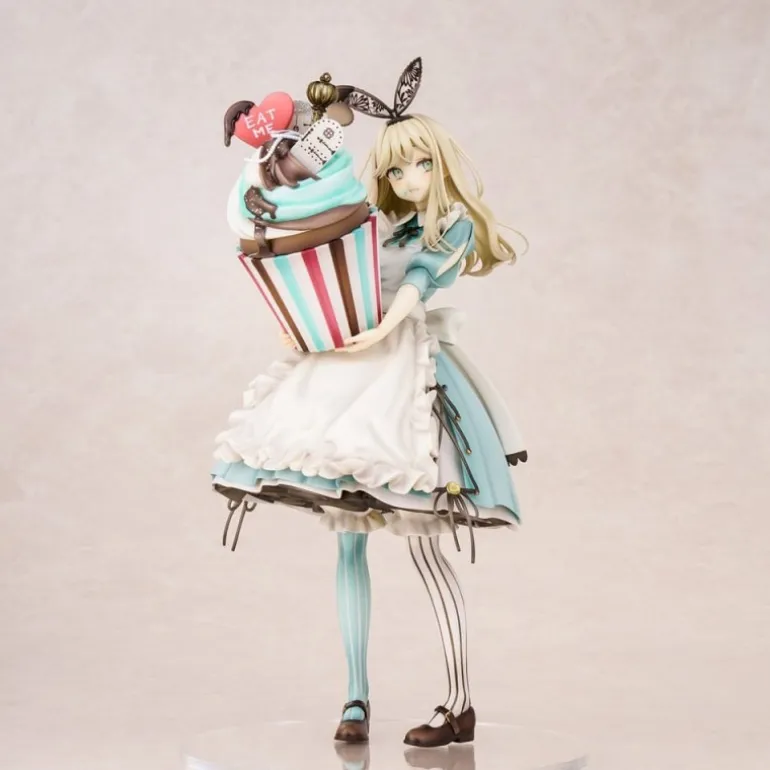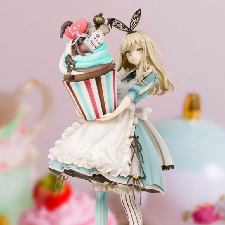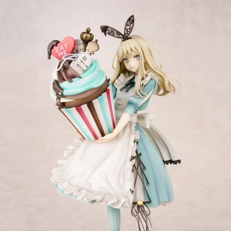 Explora el mundo de la colección con esta estatua de PVC de 1/6 basada en la ilustración de Akakura inspirada en ‘Alicia en el País de las Maravillas’. La figura presenta un diseño detallado y atractivo, con un personaje de cabello rubio y expresión encantadora, vestido con un traje azul claro y delantal blanco. El personaje sostiene un gran cupcake de colores vibrantes, decorado con un corazón rojo que dice ‘EAT ME’.