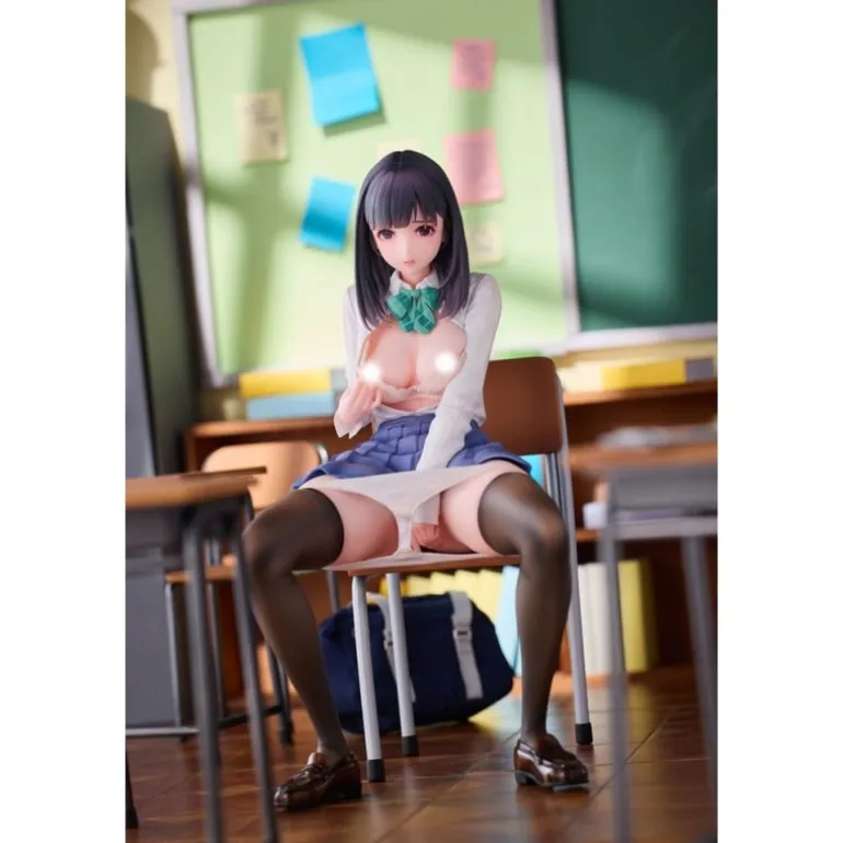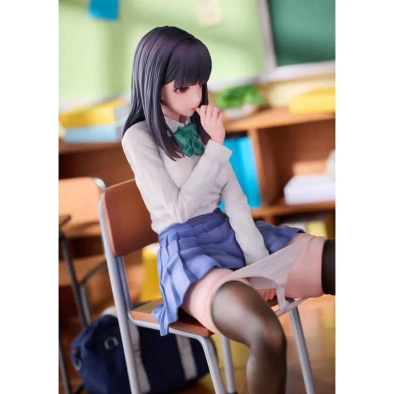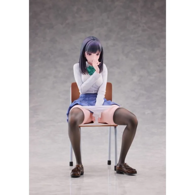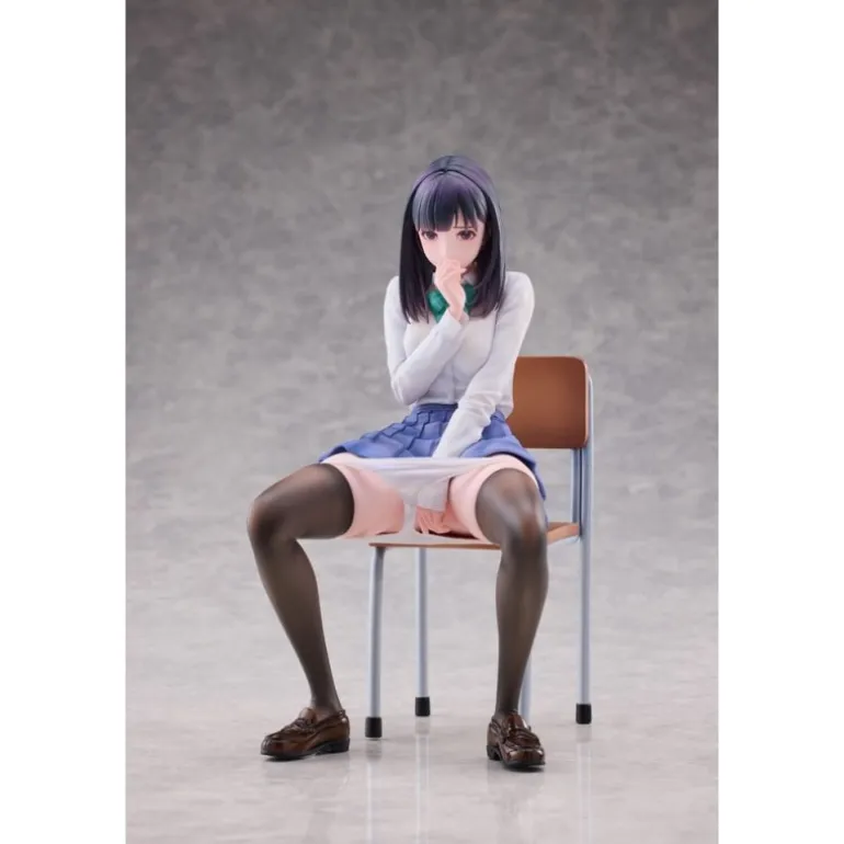 El personaje Shigure se presenta sentado en una silla, con expresión y postura que reflejan una situación sorprendente y cautivadora. Su vestimenta está meticulosamente esculpida para resaltar los pliegues de su falda y la textura de su camisa y corbata. El color de su cabello y traje se presenta en tonos realistas y atractivos, proporcionando un acabado auténtico.