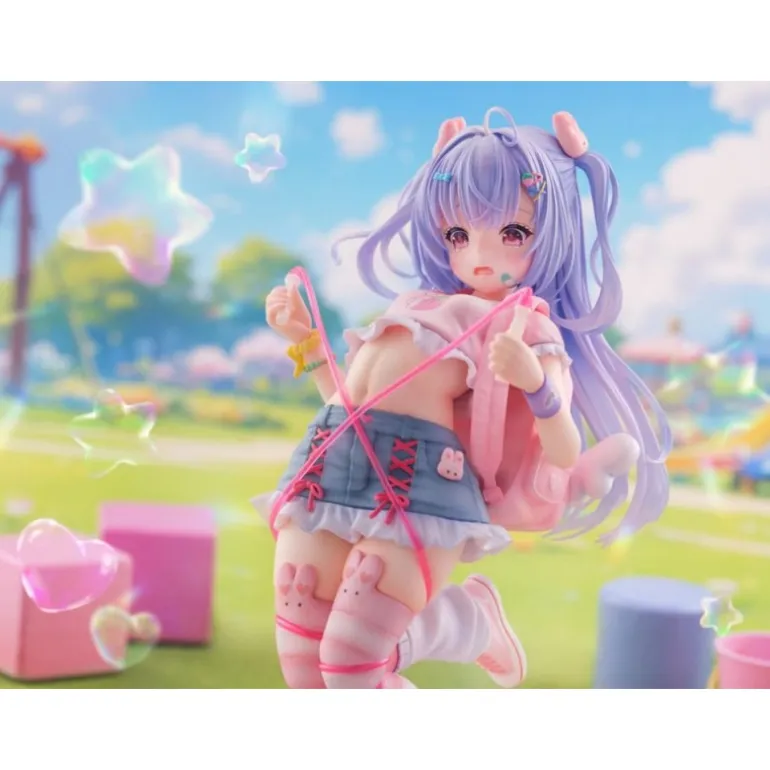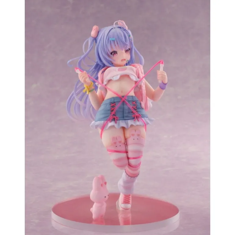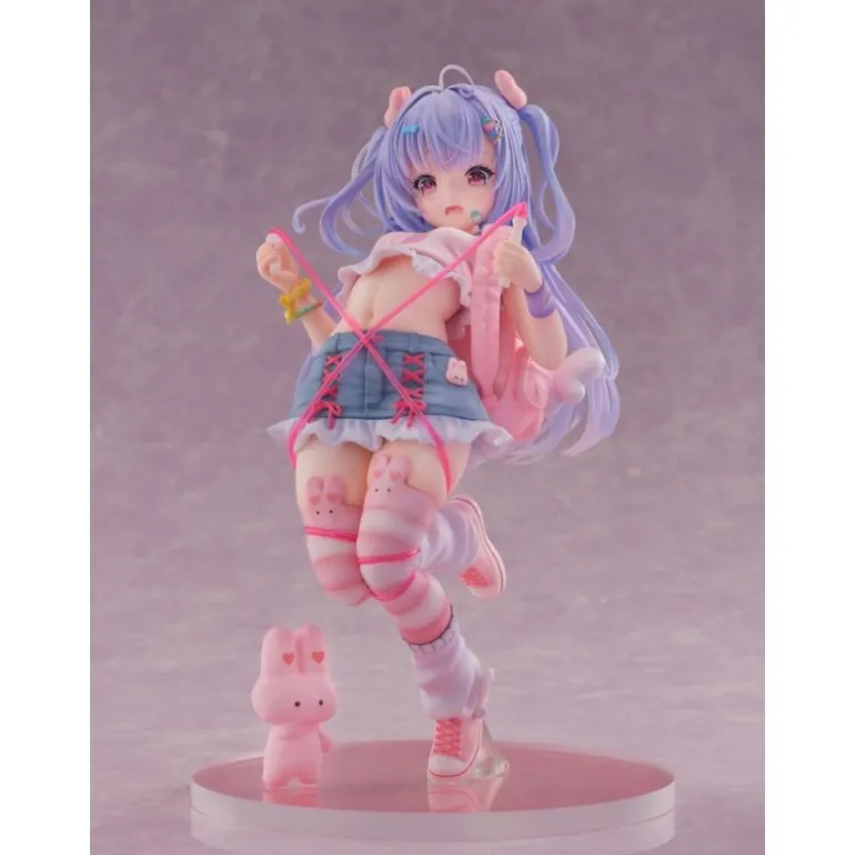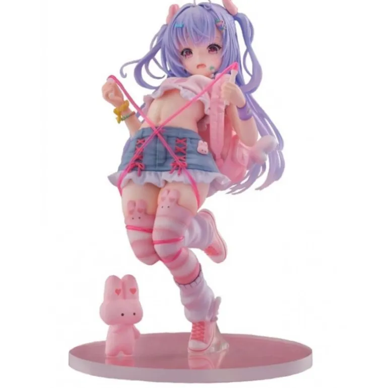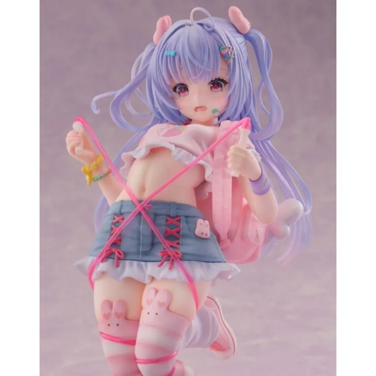 Sus brillantes ojos morados y el cabello en suaves tonos lilas le otorgan un aspecto mágico. Vestida con una falda azul con detalles rosados y unas medias decoradas con conejitos, esta figura es un deleite visual para cualquier fanático del manga y anime.