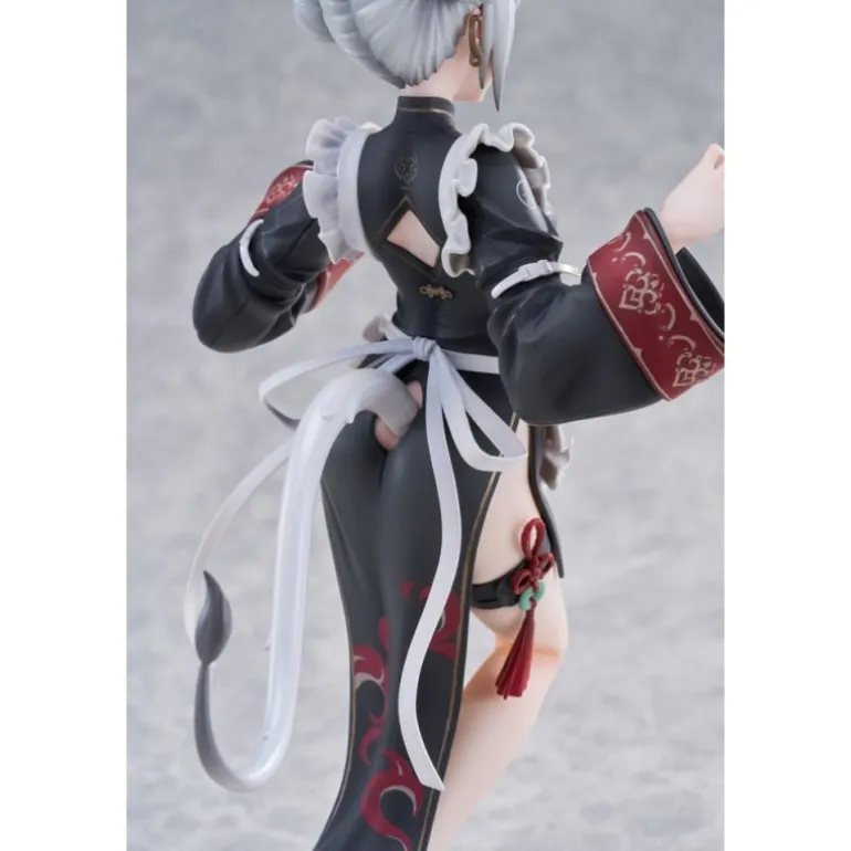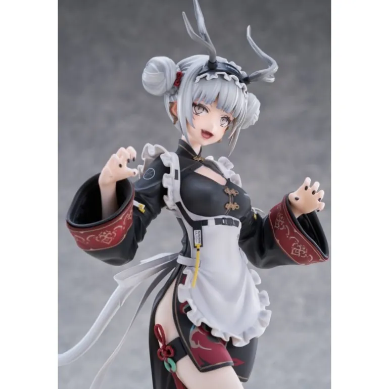 El diseño de la figura destaca por su vestimenta en tonos negros y rojizos, adornada con motivos florales y detalles dorados. Complementado con un peinado de doble moño y unos cuernos que le dan un toque místico, este personaje irradia encanto y misterio. Además, incluye un bonus: una ilustración shikishi que complementa la estética de la estatua.