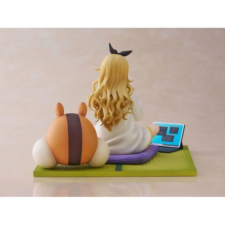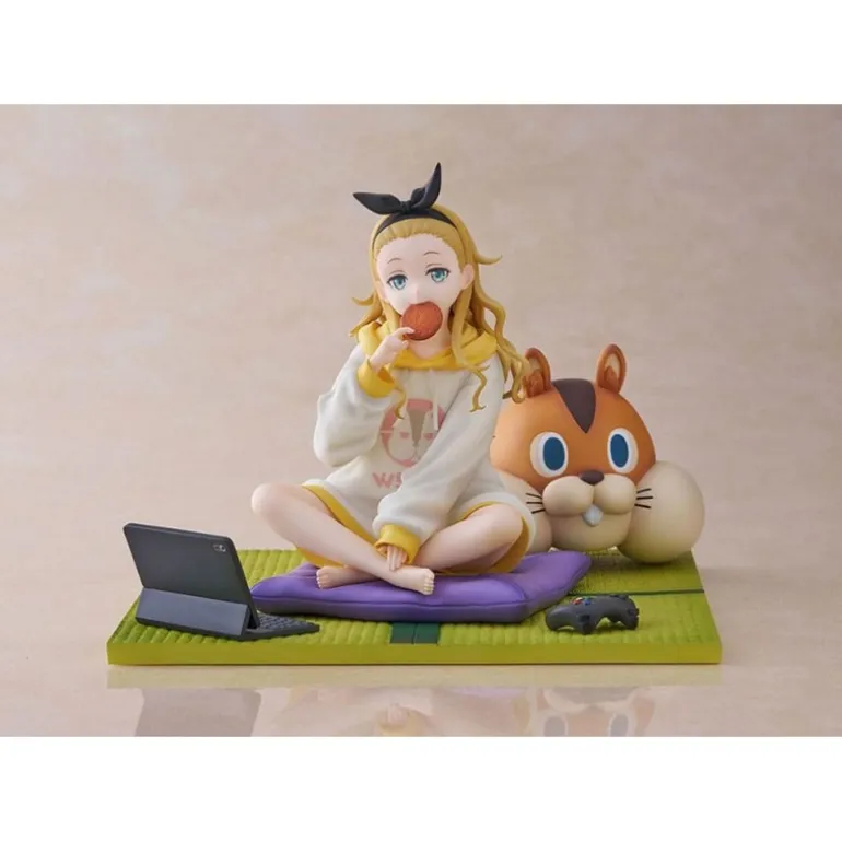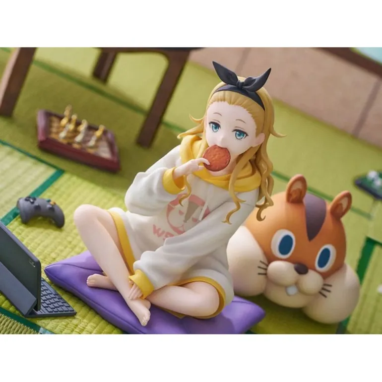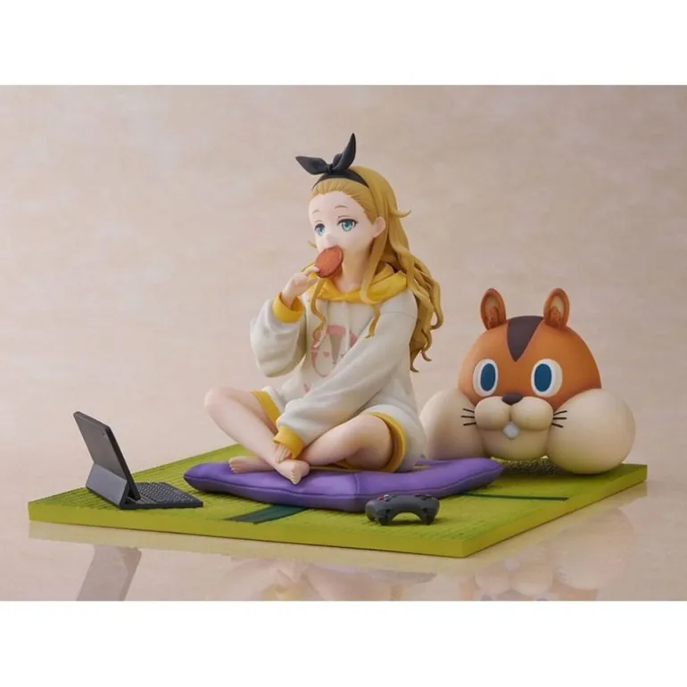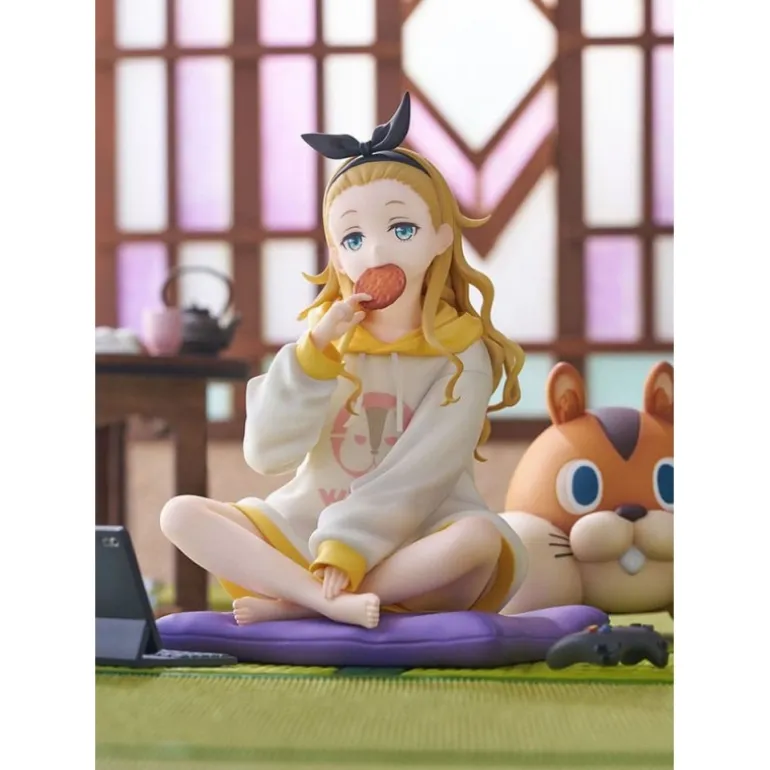 Descubre la estatua de PVC 1/7 de Kurumi inspirada en el anime ‘Lycoris Recoil’. Esta detallada figura de 13 cm muestra a Kurumi en una pose relajada, sentada con las piernas cruzadas y sosteniendo una galleta. Lleva una sudadera blanca con detalles en amarillo, que complementa su expresión serena. A su lado, un adorable cojín con forma de animal agrega un toque de encanto a la escena. La estatua descansa sobre una base verde que simula un tatami, creando un ambiente acogedor.
