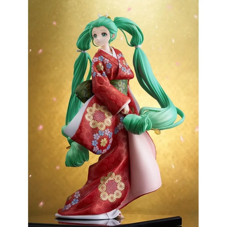 Descubre la majestuosa estatua de Hatsune Miku, parte de la colección Character Vocal Series 01. Esta impresionante figura de 28 cm captura la esencia de Miku con su característica melena verde turquesa peinada en dos coletas. El diseño detallado del kimono rojo está adornado con patrones florales tradicionales, complementado por un obi verde que resalta su gracia y elegancia.