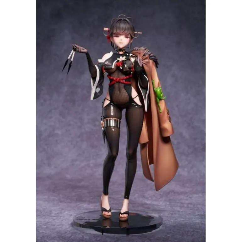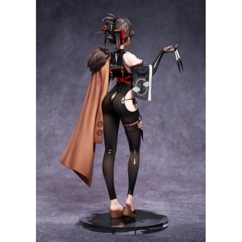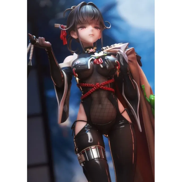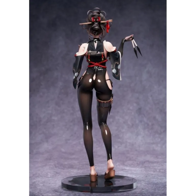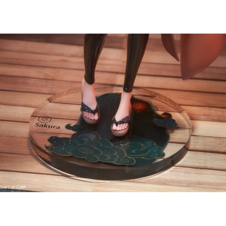 Vestida en un elegante traje negro, con transparencias estratégicas y detalles rojos, Sakura se presenta en una postura dinámica y poderosa. La base transparente con diseños de nubes añade un toque distintivo, elevando el impacto visual de la figura.