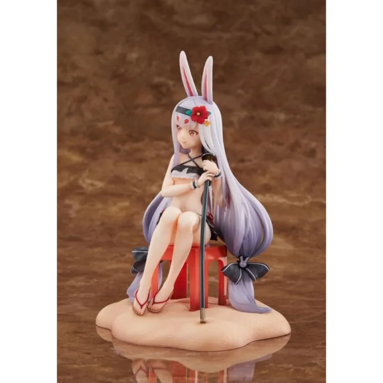 Fabricada en PVC de alta calidad por Elegant, esta figura destaca por su increíble nivel de detalle. Shimakaze luce un traje veraniego con orejas de conejo, un accesorio floral rojo en el cabello y sandalias rojas, todo sobre una base que simula arena. El acabado detallado de su cabello largo y lila le otorga un realismo impresionante.