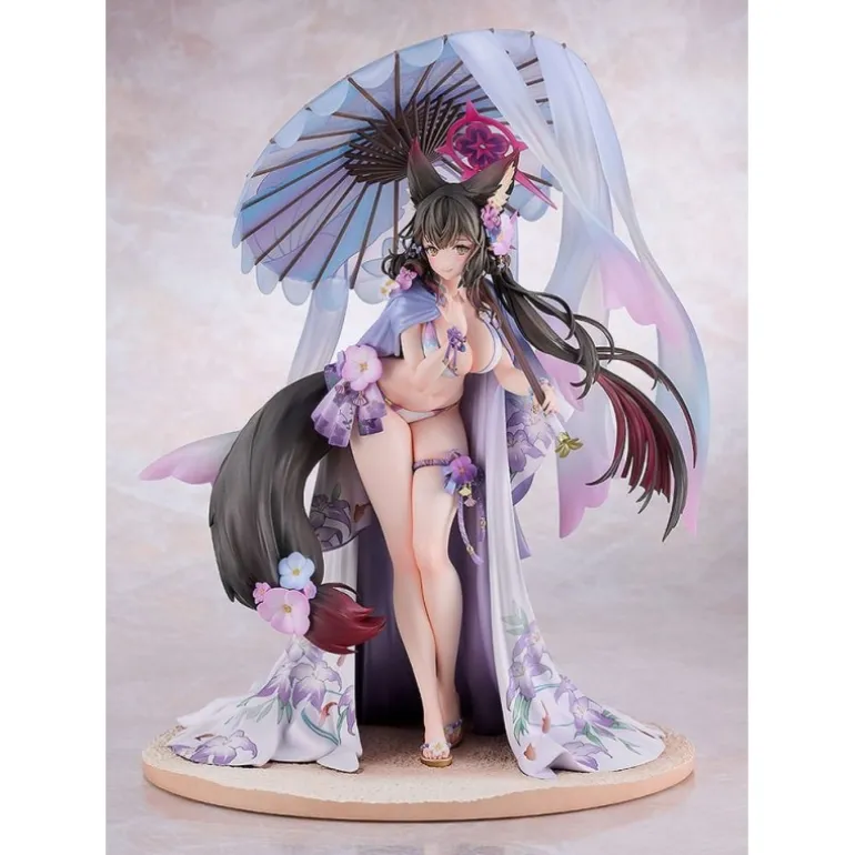 Wakamo se presenta con un elegante traje de baño decorado con flores y un parasol, lo que le da un toque veraniego y sofisticado. Su expresión serena y los adornos florales realzan su encanto, mientras que su postura y la fluidez de su cabello añaden dinamismo a la figura.