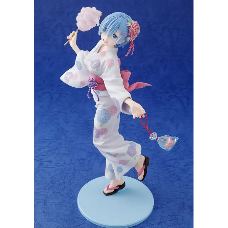 Descubre la belleza de Rem en esta detallada estatua de PVC de 23 cm, inspirada en el popular anime «Re:ZERO -Starting Life in Another World-«. Esta figura presenta a Rem con un elegante yukata adornado con flores de colores pastel, resaltando su encantadora personalidad. Sostiene un dulce de algodón rosa en una mano y un pequeño pez dorado en bolsa en la otra, evocando la atmósfera de un alegre festival japonés.