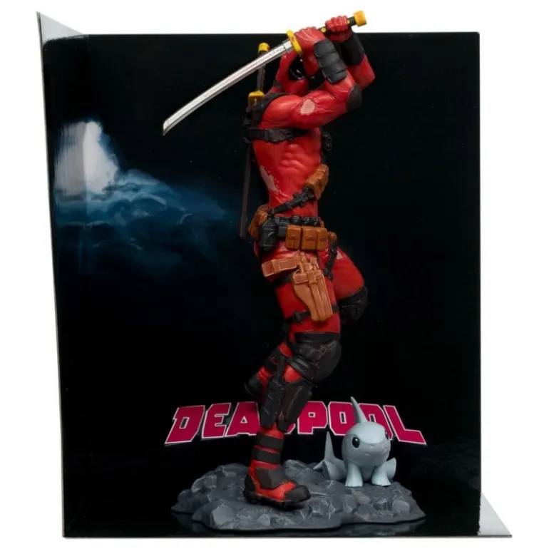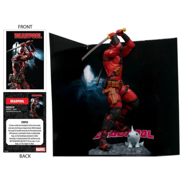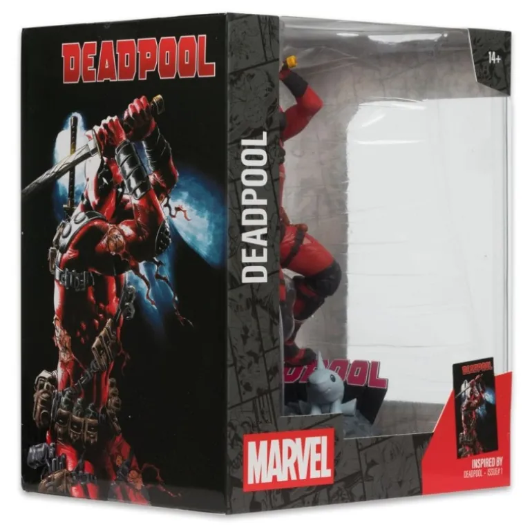 Vívidamente detallada, la estatua muestra el icónico traje rojo y negro de Deadpool, con accesorios como cartucheras y protectores de rodilla meticulosamente esculpidos. Perfecta para fanáticos del cómic o para aquellos que buscan un regalo original. Viene en una caja con ventana, ofreciendo una vista clara del producto mientras permanece protegido.