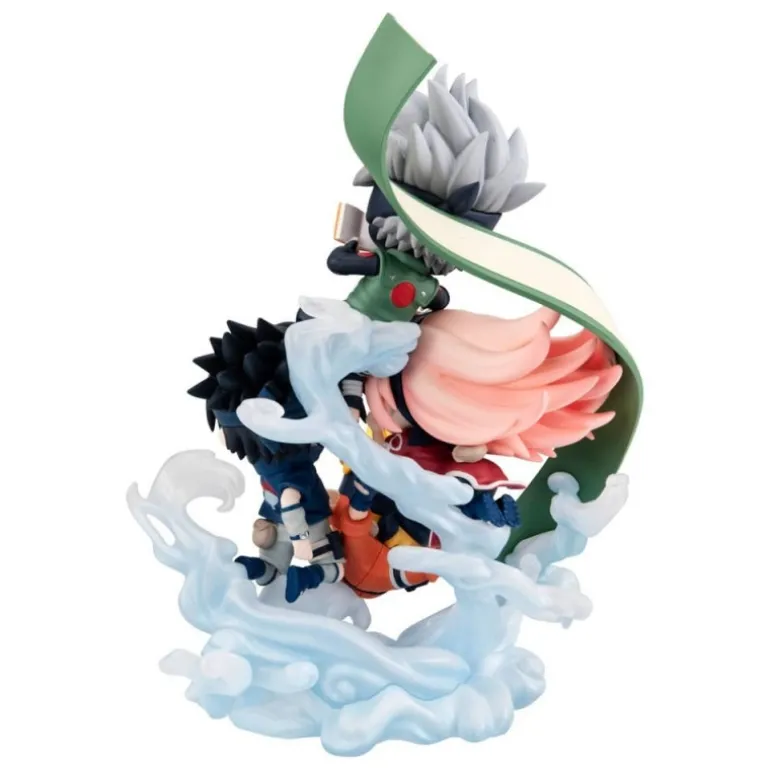 La figura muestra a los queridos personajes con un estilo chibi encantador, encaramados sobre una base que simula un dinámico remolino de agua. Los detalles, desde el cabello de Naruto hasta los distintivos accesorios de Kakashi, están cuidadosamente reproducidos, capturando a la perfección la esencia del anime.