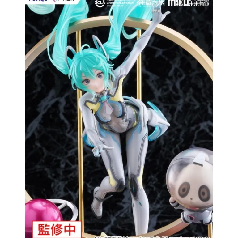 Descubre la majestuosa estatua de PVC de Hatsune Miku, una pieza que captura la esencia futurista y encantadora de este icónico personaje. Con un tamaño aproximado de 29,5 cm, esta estatua destaca por su intrincado diseño y colores vibrantes. Miku se presenta en una pose dinámica, con su largo cabello azul extendiéndose en el aire. El escenario incluye elementos cósmicos como planetas y estrellas, realzando la atmósfera de ciencia ficción.