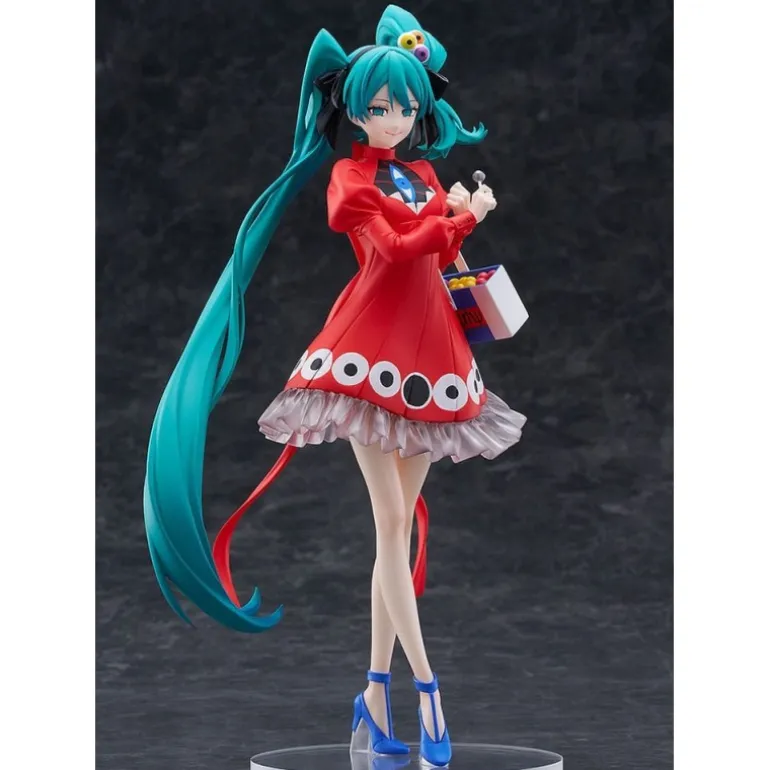 Descubre la estatua de PVC de Hatsune Miku en su versión Psi Ver., una joya coleccionable de la serie Character Vocal Series 01. Con una altura aproximada de 23 cm, esta figura muestra a Miku con su icónico cabello azul verdoso recogido en coletas altas. Lleva un vestido rojo vibrante adornado con patrones circulares en blanco y negro y detalles en volantes translúcidos en la parte inferior. Sus zapatos de tacón azul intenso completan un look moderno y llamativo. Además, sostiene una caja de dulces que añade un toque encantador al diseño. Fabricada por Good Smile Company, esta estatua de colección viene en una práctica caja con ventana, perfecta para exhibirla sin sacarla de su embalaje. Es un producto con licencia oficial, asegurando su calidad y originalidad, ideal tanto para un regalo creativo como para enriquecer tu colección personal.