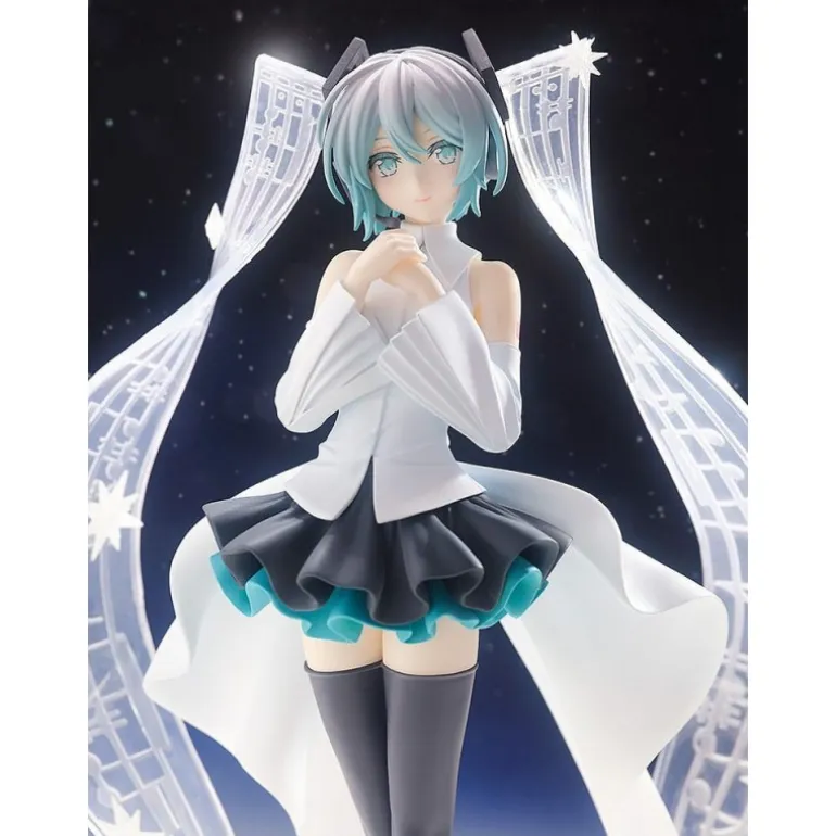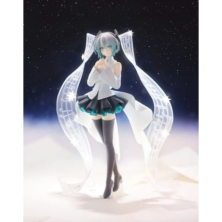 Con una altura aproximada de 18 cm, la estatua presenta a Hatsune Miku vistiendo un encantador conjunto blanco y negro. Su falda tiene un acabado ondulado con tonos azul turquesa que añaden un toque de color vibrante. Los detalles son exquisitos, desde su cabello azul claro hasta sus características medias largas.