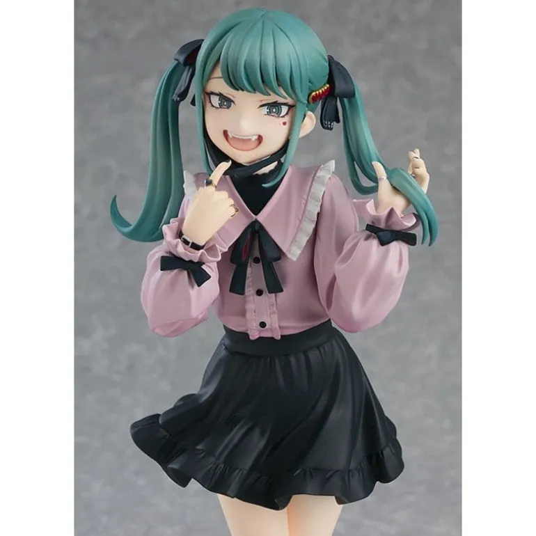 La estatua de PVC Pop Up Parade L Hatsune Miku The Vampire Ver. es una deslumbrante pieza de colección que captura la esencia encantadora y vampírica de Miku. Con un diseño meticuloso, esta figura presenta detalles finamente elaborados en sus 24 cm de alto, desde el expresivo rostro con colmillos hasta el conjunto de blusa rosa y falda negra. Las coletas verdes de Miku añaden ese toque icónico que los fans adorarán.