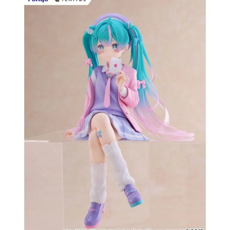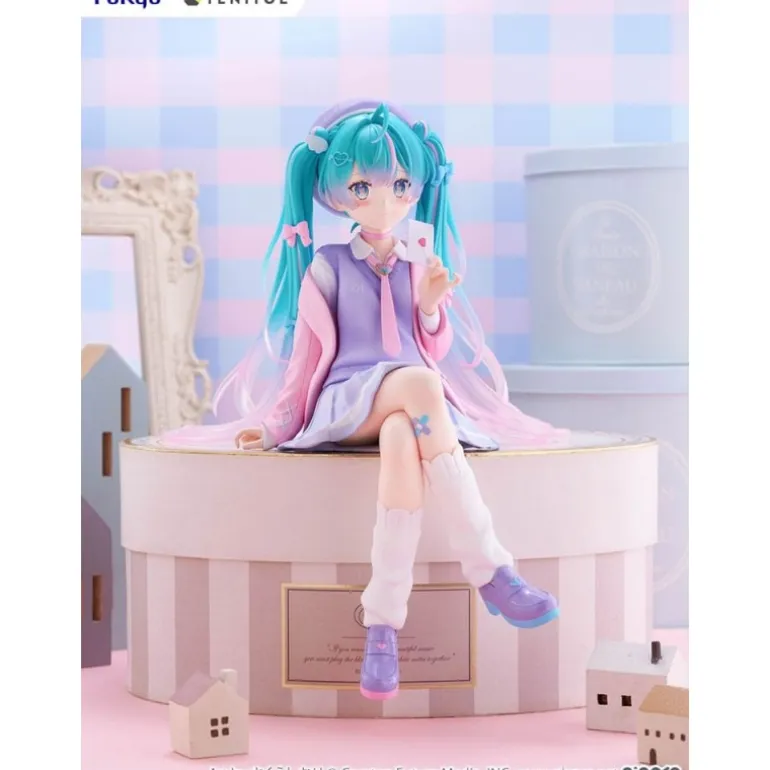 Descubre la encantadora estatua de PVC de Hatsune Miku, una pieza de colección que los fans del manga y anime adorarán. Con una altura de aproximadamente 32 cm, esta estatua captura a Hatsune Miku con un detalle impresionante. Vestida con un atuendo adorable que combina diferentes tonos de pastel, la figura presenta una mezcla de rosa y lavanda que resalta su peinado de coletas largas azul turquesa, adornado con pequeños lazos y accesorios.