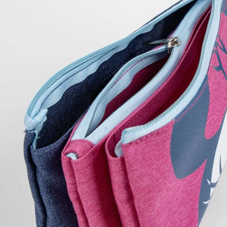 Con tres compartimentos espaciosos, este estuche te permitirá organizar lápices, bolígrafos y otros accesorios de manera eficiente. Cada compartimento está asegurado con una cremallera de color azul claro que contrasta elegantemente con el diseño general del estuche. Además, el reverso del estuche tiene un fondo azul marino con un logo de Minnie, aportando un toque de distinción.