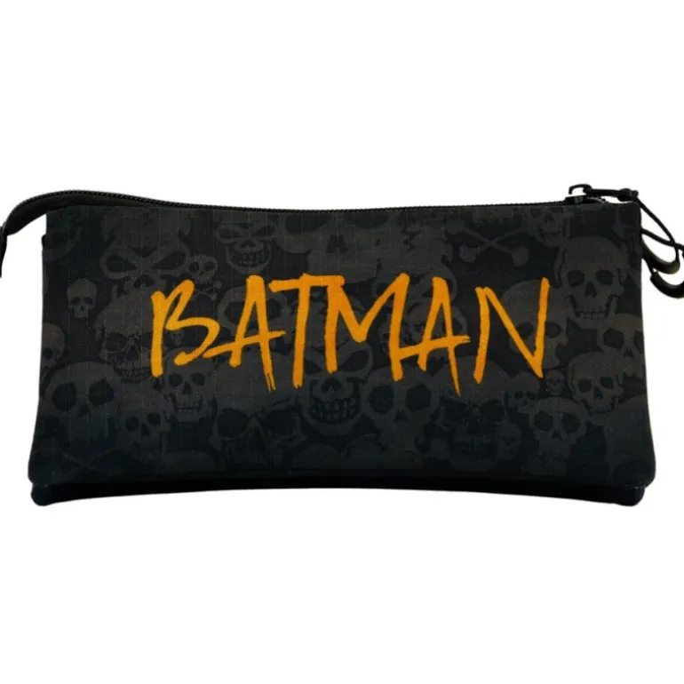 Se trata de un estuche con tres compartimentos diferentes y cuenta con cierre de cremallera, con un tamaño perfecto para usarlo en el día a día y llevarlo allá a donde vayas. Mide aproximadamente 23,5 x 11 x 5 cm, cuenta con una extraordinaria calidad tanto en materiales como en acabados y licencia oficial de DC. Y no te pierdas su fantástico diseño, en color negro y con el mítico símbolo de Batman, con la silueta del murciélago, que en este caso tiene en su interior el rostro de Batman.