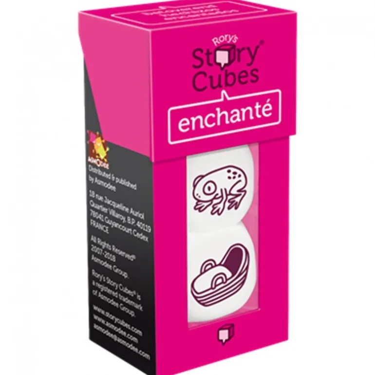 La caja, en un vibrante color fucsia, muestra algunos de los intrigantes diseños de los dados, como una rana encantada y un sombrero mágico, invitando a los jugadores a desatar su creatividad. Estos dados son una adición perfecta a tu base de Story Cubes o para combinar con otras expansiones para crear aventuras ilimitadas.