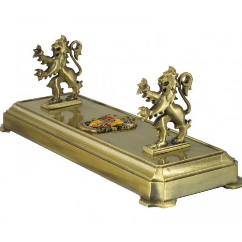 Se trata de una pieza que mide aproximadamente 20 x 7 x 7 cm, fabricada en metal fundido a presión con detalles esmaltados. Y su diseño es una auténtica maravilla, con la pieza principal en un tono dorado muy elegante, dos piezas a los lados que sujetan la varita y que son en realidad dos pequeñas esculturas del león rampante que representa a Gryffindor y el escudo de armas de la casa, con todos sus detalles, en relieve en el centro de este expositor. Una auténtica delicia en la que exponer tus varitas favoritas y dejar boquiabierto a todo el que te visite.