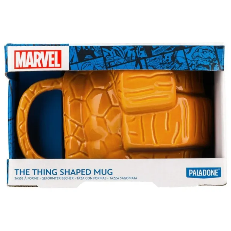 Descubre la taza de cerámica The Thing de los Cuatro Fantásticos, diseñada con la inconfundible textura rocosa de este icónico personaje de Marvel. Con una capacidad de 330 ml, esta taza es perfecta para disfrutar de tus bebidas favoritas mientras rindes homenaje a uno de los superhéroes más memorables. Fabricada por Paladone Products con licencia oficial, garantiza calidad y autenticidad. Es un regalo ideal para fans de los cómics, o simplemente para darte un capricho especial. Su diseño único no solo es funcional, sino que también añade un toque de aventura a tu colección de tazas.