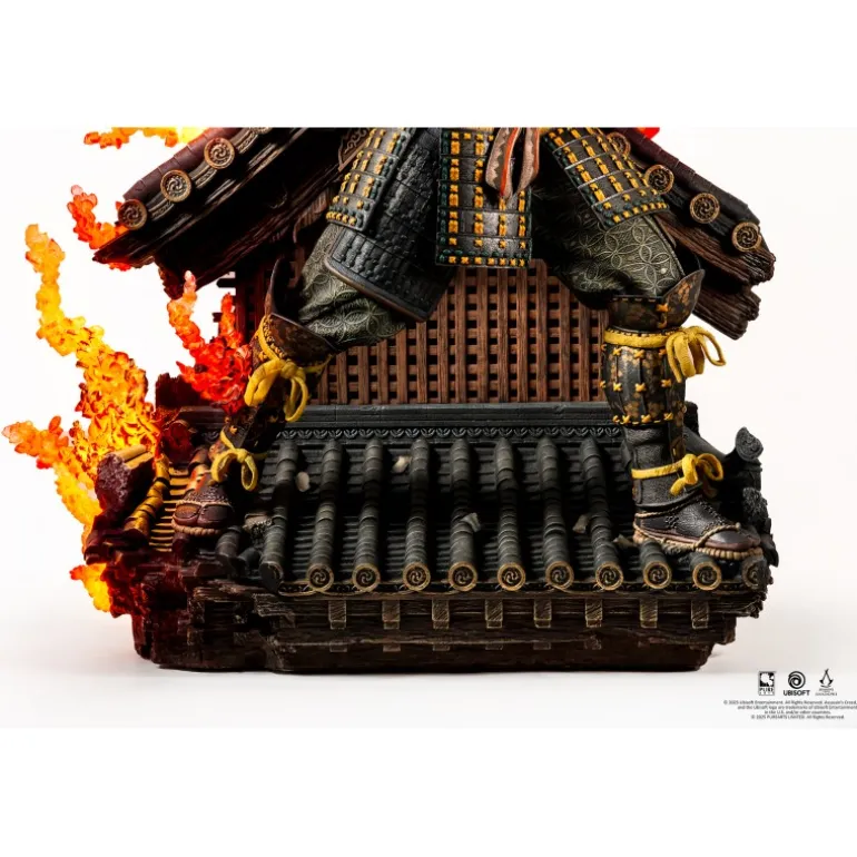 - Estatua hiperdetallada de Naoe & Yasuke con base de tejado tenshu.
