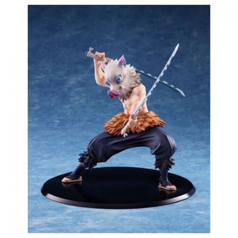 Descubre la impresionante figura de Inosuke Hashibira del famoso anime Demon Slayer: Kimetsu no Yaiba. Esta estatua, fabricada por Aniplex en PVC de alta calidad, destaca por su detallado diseño y expresión dinámica. Con una altura aproximada de 20 cm, representa al personaje en una pose de acción, con su característico casco de jabalí y katanas doble.