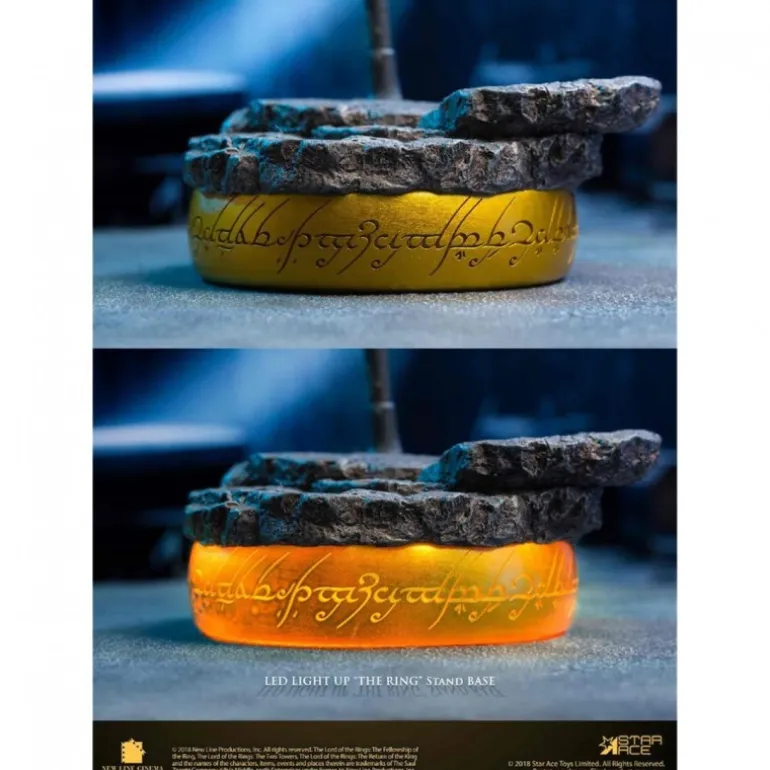 La figura está pintada a mano para garantizar la máxima calidad y viene acompañada de numerosos accesorios para mejorar su exhibición. Uno de sus puntos más destacados es la base que brilla en la oscuridad, diseñada con el texto del Anillo Único, que añade un toque único y mágico.