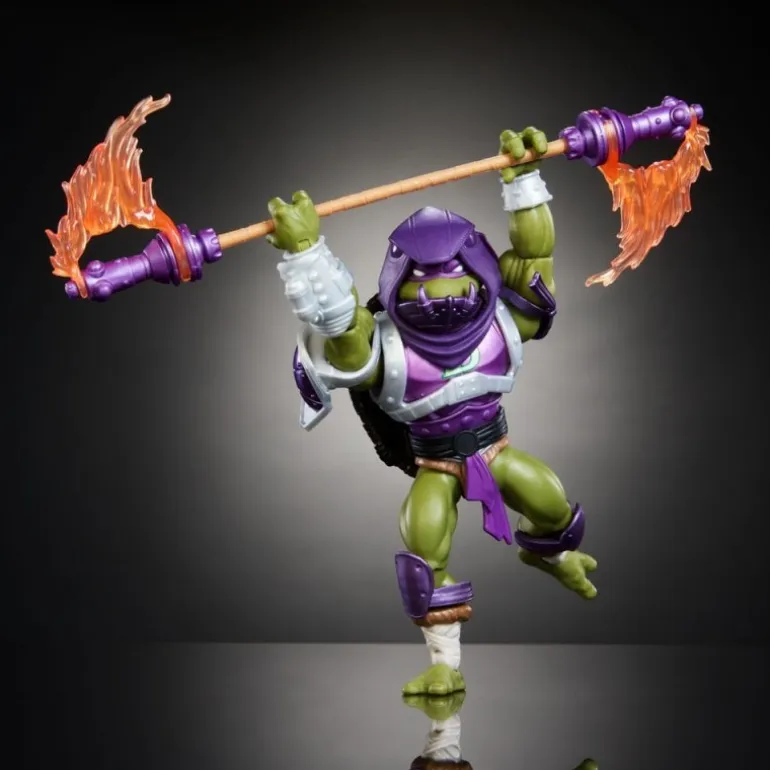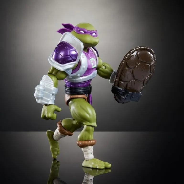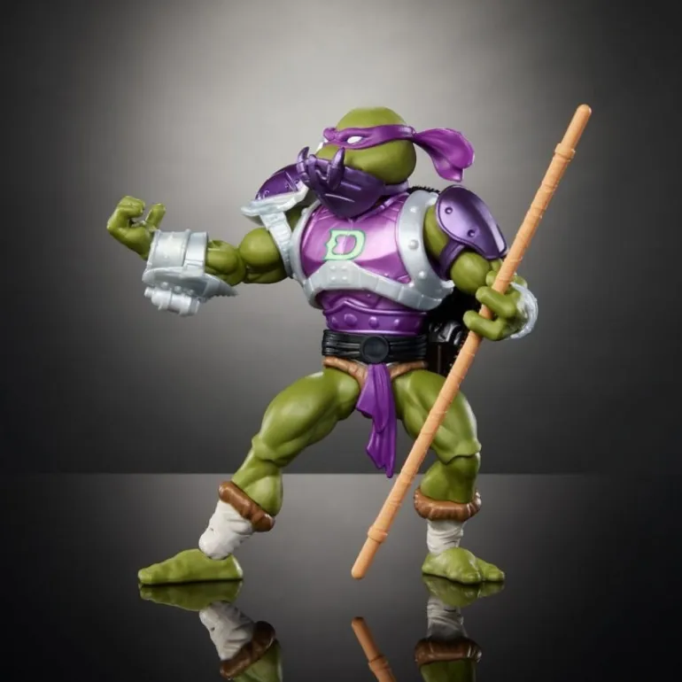 La figura presenta a Donatello con una armadura morada rica en detalles, que combina a la perfección elementos de los ‘Masters of the Universe’ y ‘Teenage Mutant Ninja Turtles’. Cada pieza de armadura, en tonos morados y plateados, añade un toque distintivo, mostrando su emblema ‘D’ en el pecho.