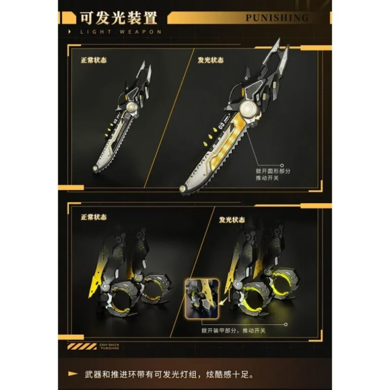 El diseño incorpora piezas articuladas que permiten colocar la figura en diversas poses dinámicas, ideal para coleccionistas y aficionados del género manga y anime. Además, sus armas y accesorios cuentan con detalles iluminados que añaden un toque futurista y sofisticado a cualquier colección.