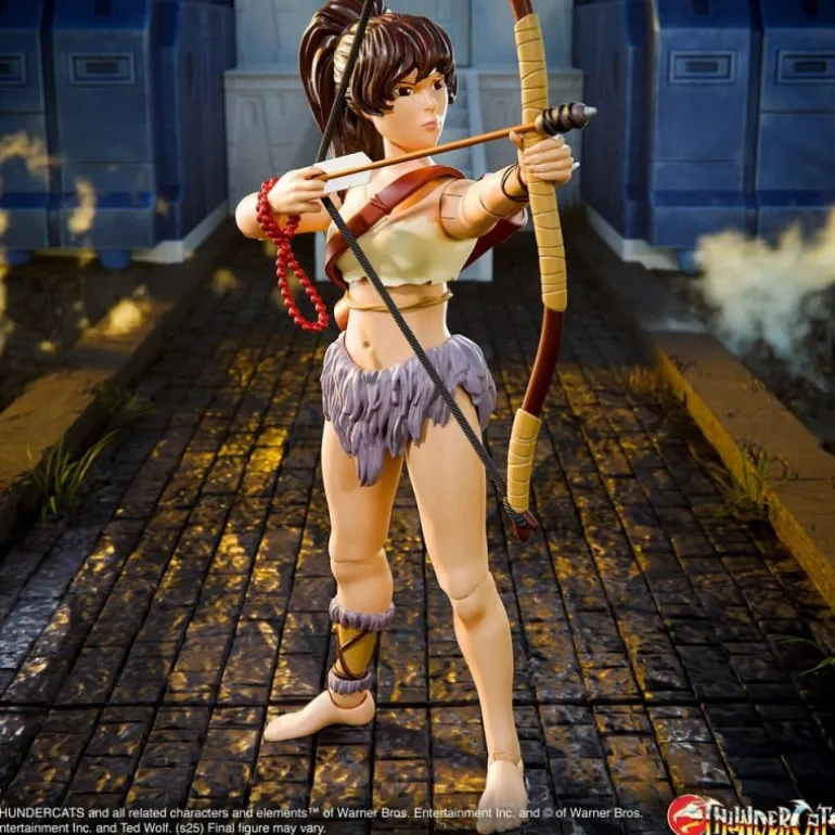 Su atuendo detallado refleja su icónico look, con un top amarillo y falda de corte tribal. El set se completa con un carcaj y una cuerda de cuentas rojas, perfectas para recrear escenas memorables de la serie.