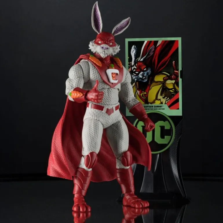 Descubre la impresionante figura articulada de Captain Carrot, una joya exclusiva de la línea DC Multiverse. Este personaje único, parte de Justice League Incarnate, se distingue por su aspecto llamativo. La figura de 18 cm destaca con un traje blanco texturizado y detalles en rojo intenso, incluyendo una capa fluida que resalta su figura dinámica.