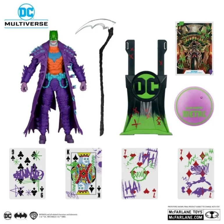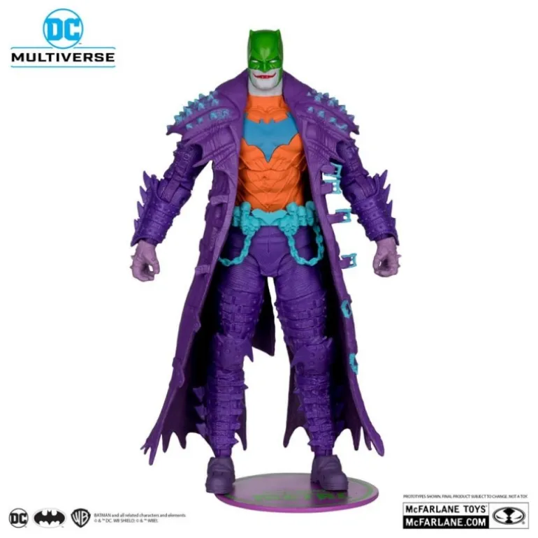 La figura articulada de Batman en su versión Jokerized de la serie Dark Nights: Death Metal es una pieza única para coleccionistas. Con su imponente altura de 18 cm, esta figura destaca por su detallado diseño y los vibrantes colores que la componen. El traje, predominantemente morado, está cubierto por una capa con notables detalles en azul y púas en los hombros, contrastando con un torso naranja y el símbolo de murciélago en azul claro. Su máscara verde completa la sorprendente paleta de colores. Fabricada por McFarlane Toys, la figura pertenece a la exclusiva etiqueta Gold Label, garantizando calidad y detalle excepcionales. Viene en un embalaje con motivos gráficos, reflejando el oscuro universo de DC. Diseño robusto con 22 puntos de articulación para poses dinámicas, convirtiéndola en un must-have para cualquier fan del universo DC.