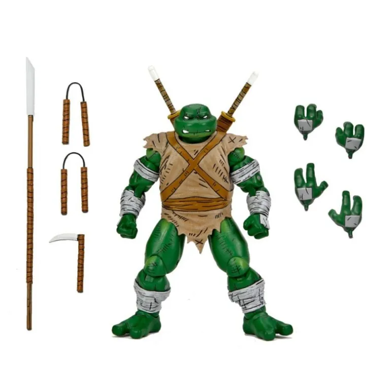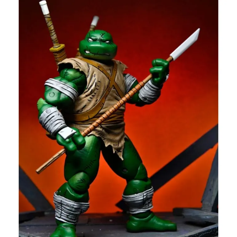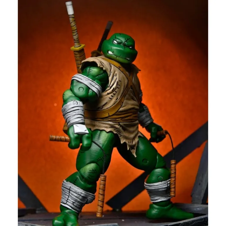 Con 18 cm de altura, Michelangelo está listo para la acción. Presenta un aspecto robusto, con una piel verde intensa y una vestimenta desgastada que evoca su espíritu aventurero. Los detalles en sus vendajes y su atuendo rasgado otorgan un realismo sorprendente, transportando a los seguidores al mundo de las Tortugas Ninja.