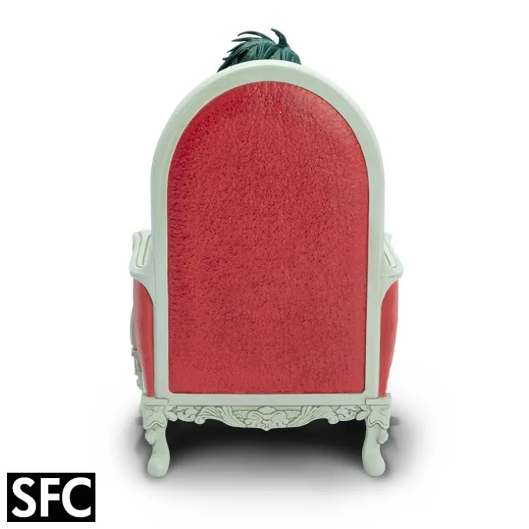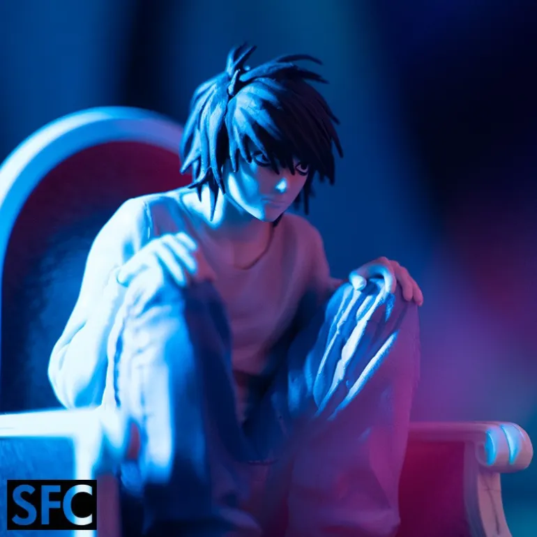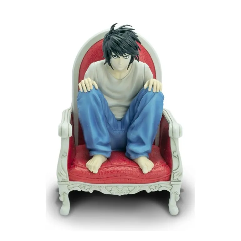La figura representa a enigmático y pensativo L fabricado en PVC de gran calidad y en una de sus más célebres poses, sentado en cuclillas sobre una silla enorme. No dejes de ver todas las fotos para que puedas apreciar todos los detalles. Mira por ejemplo lo mullido que parece estar el asiento y la sensación de realidad que da el excelente trabajo de pintura.