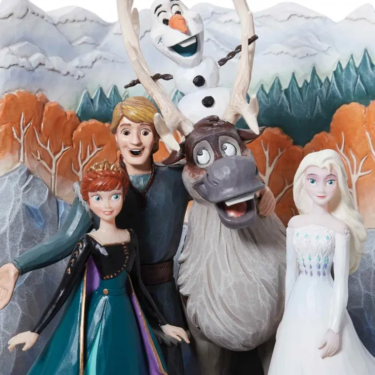 Descubre la mágica figura decorativa de Frozen 2 de ENESCO. Con un tamaño de 18x18x18,5 cm, esta pieza única presenta a tus personajes favoritos: Elsa, Anna, Olaf, Kristoff y Sven, recreados con gran detalle. Cada figura está hábilmente elaborada y pintada a mano, mostrando la habilidad artesanal en su corazón tallado.