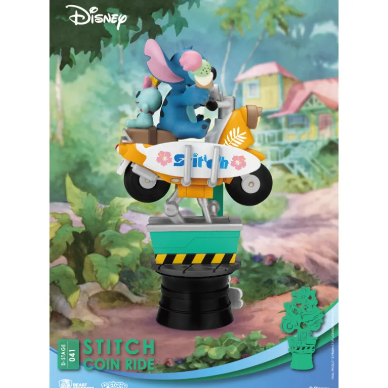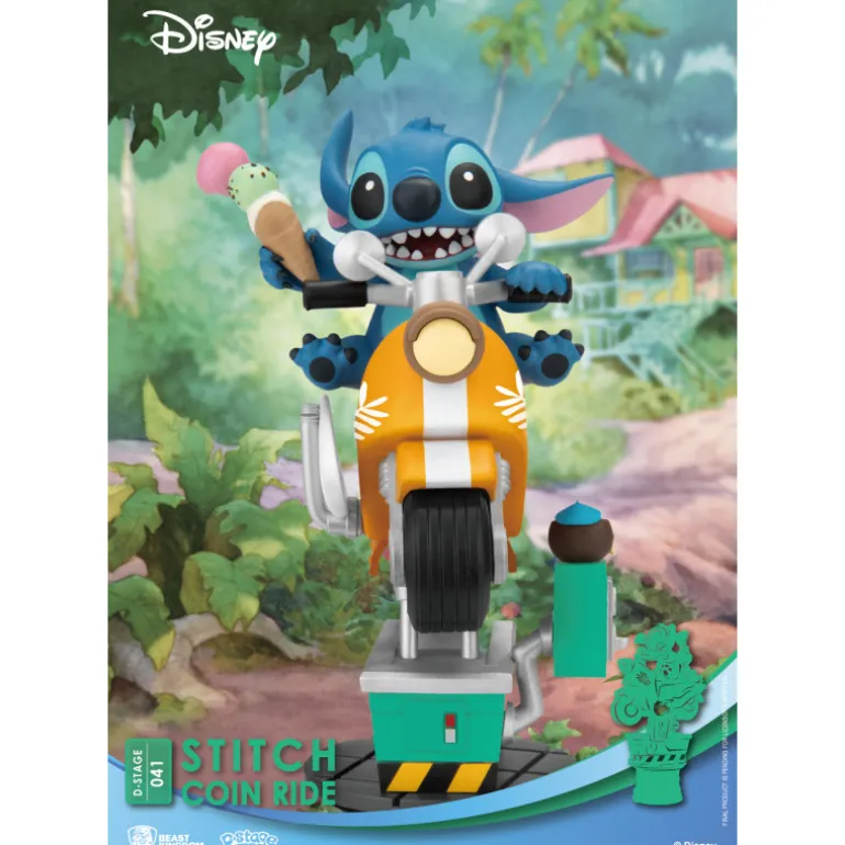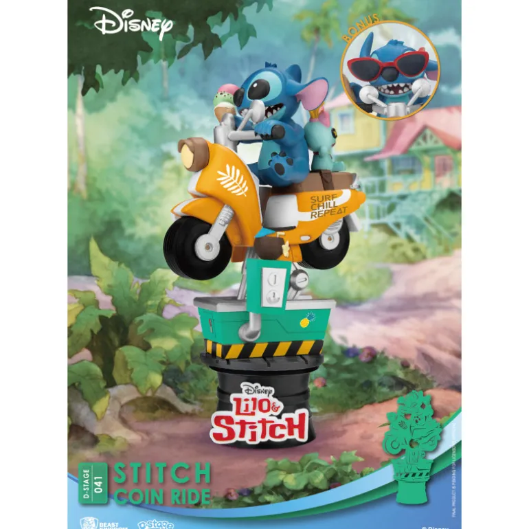 Se trata de un diorama que incluye una detallada figura del adorable Stitch, montado en una motillo de esas a las que se les echa monedas y se mueven. Se trata de un diorama fabricado en PVC, con una cantidad de detalles excepcional y fidelidad absoluta a los personajes originales, pintados a mano cuidadosamente. Mide aproximadamente 16 cm de alto y tiene el logotipo de Lilo y Stitch en la base perfectamente reproducido.